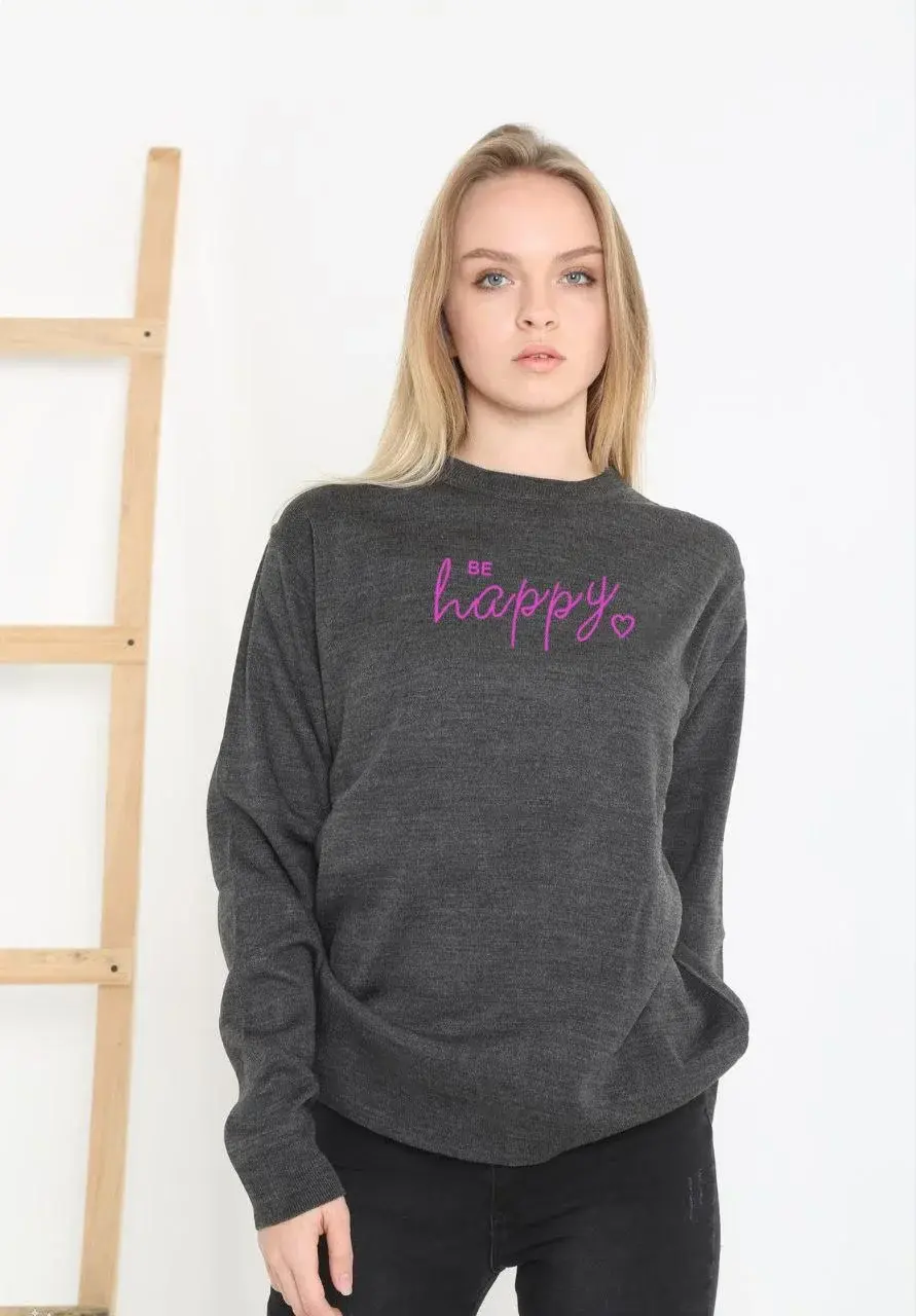 Baskılı Uzun Kol Yarım Boğazlı Dokuma Triko - Füme