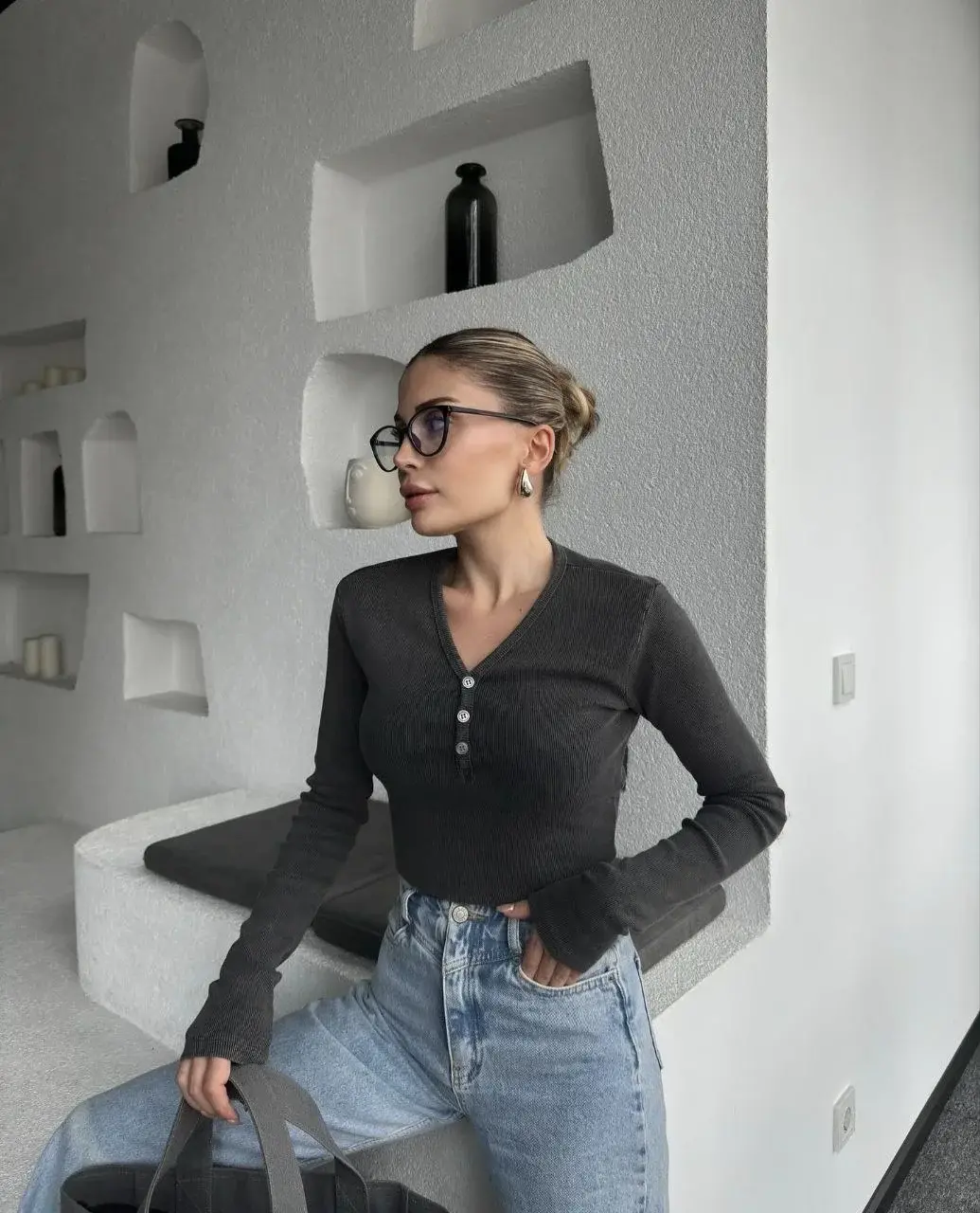 Düğme Detaylı Yıkamalı Crop