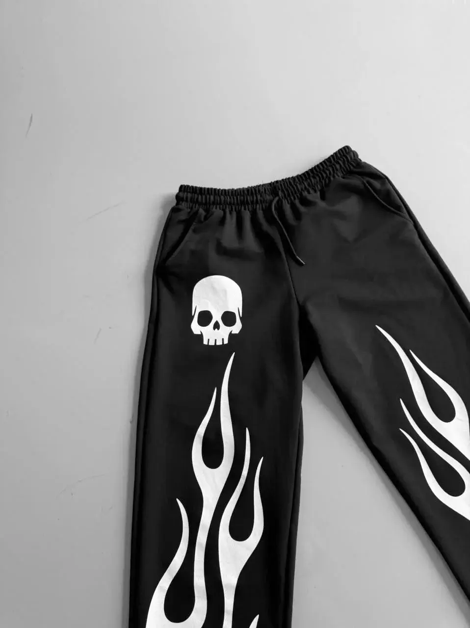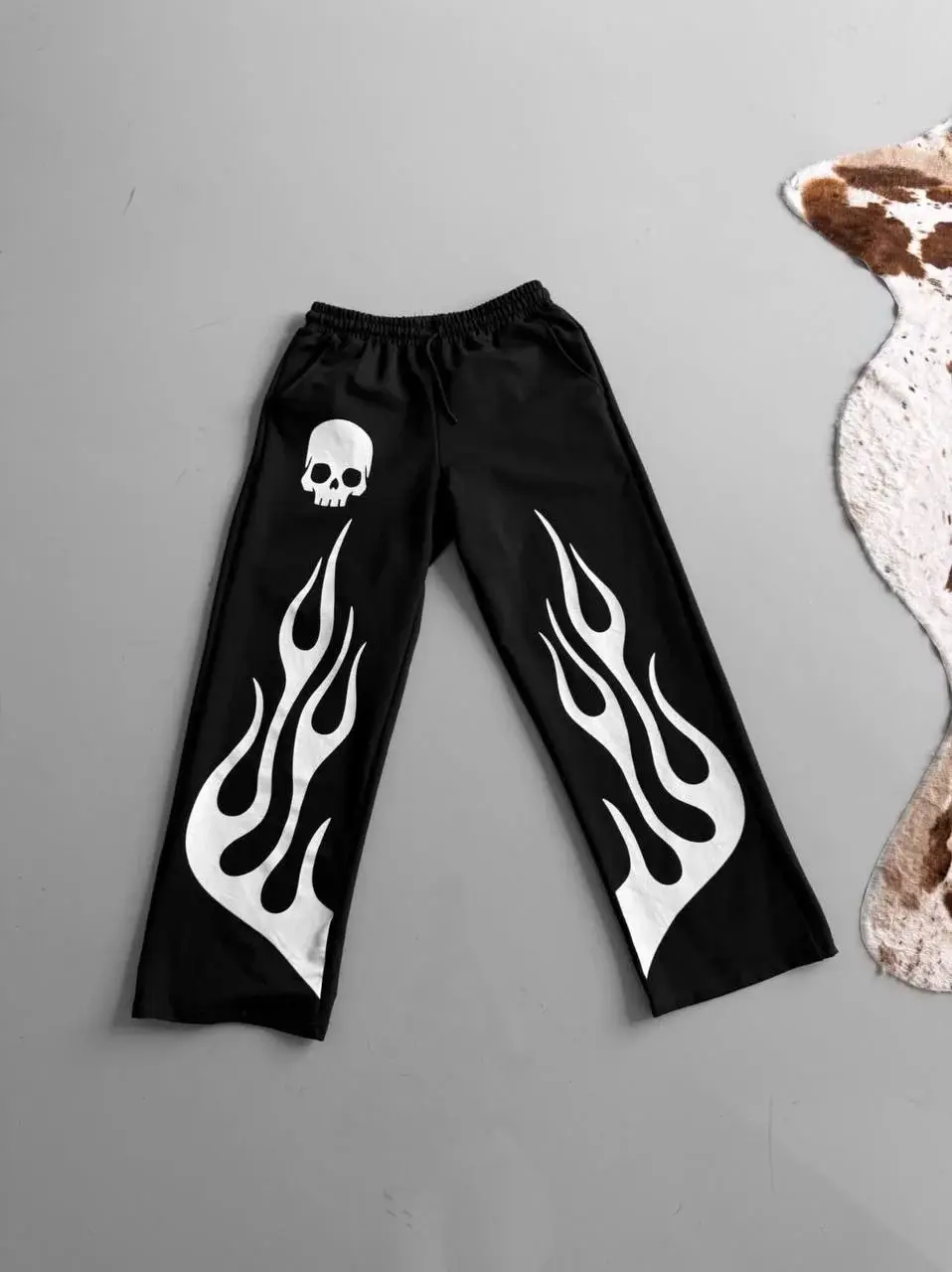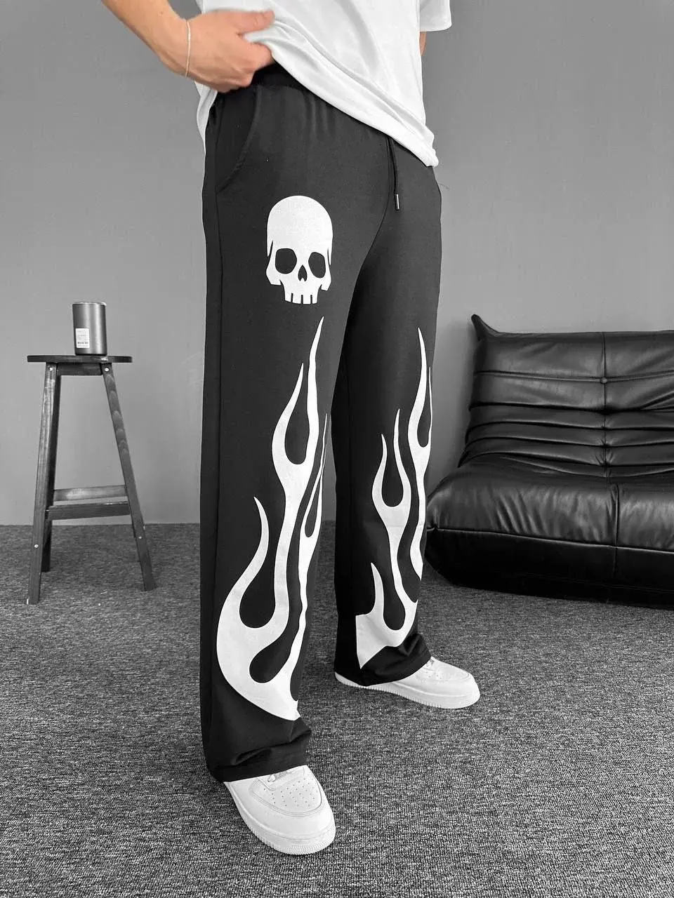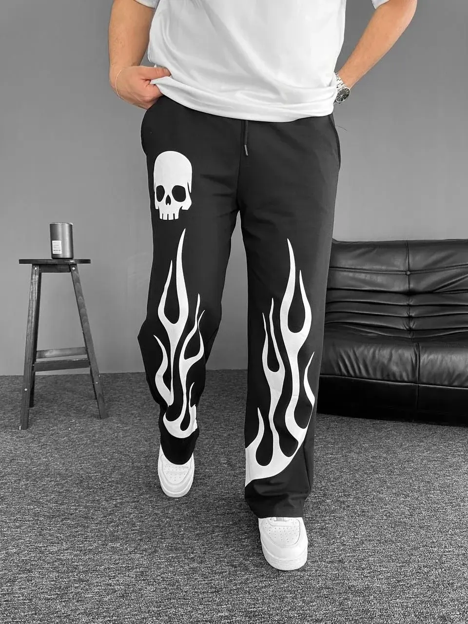 İki İplik Kumaş Baskılı Beli Lastikli Boru Paça Baggy Alt Esofman - Siyah
