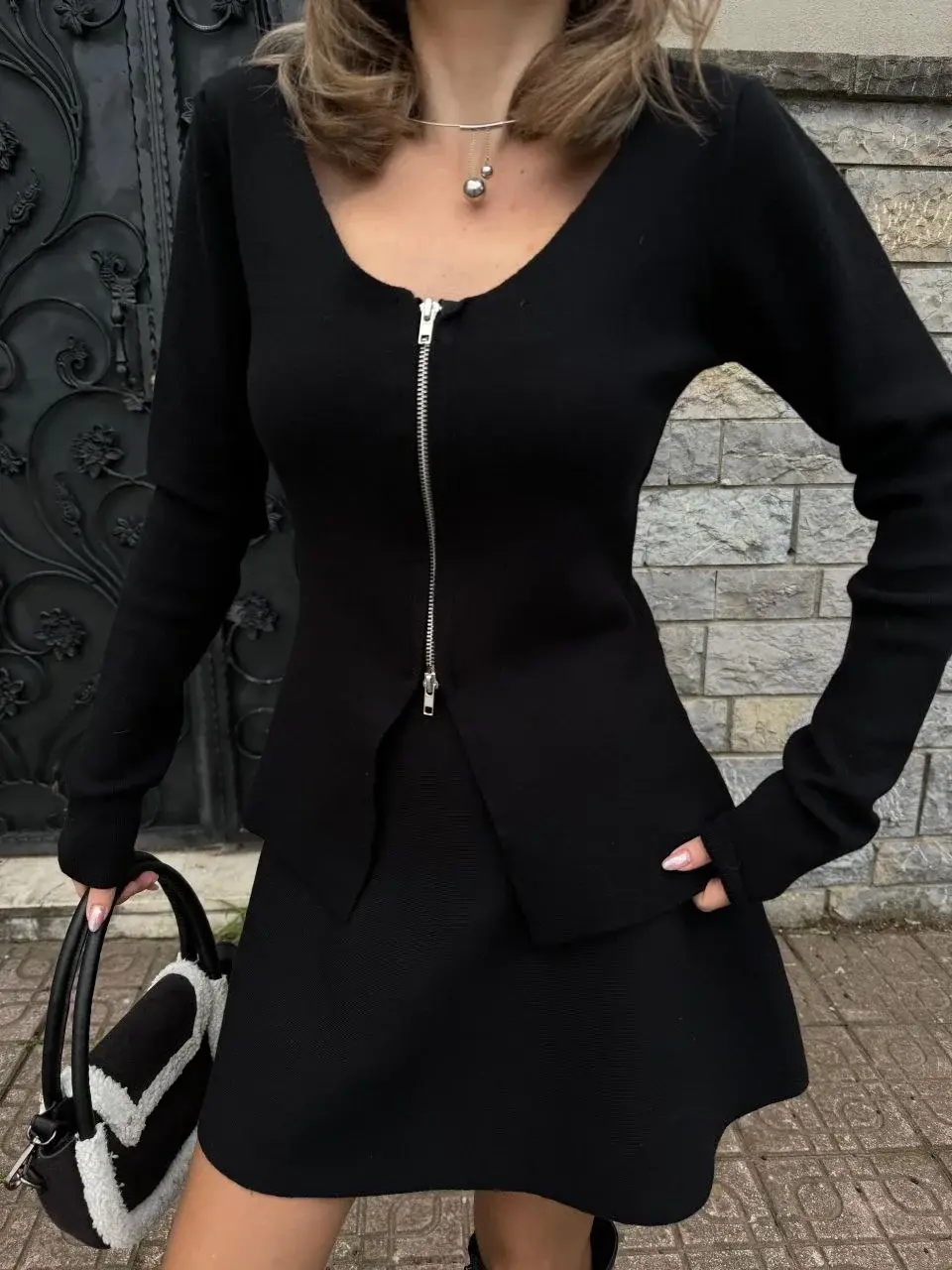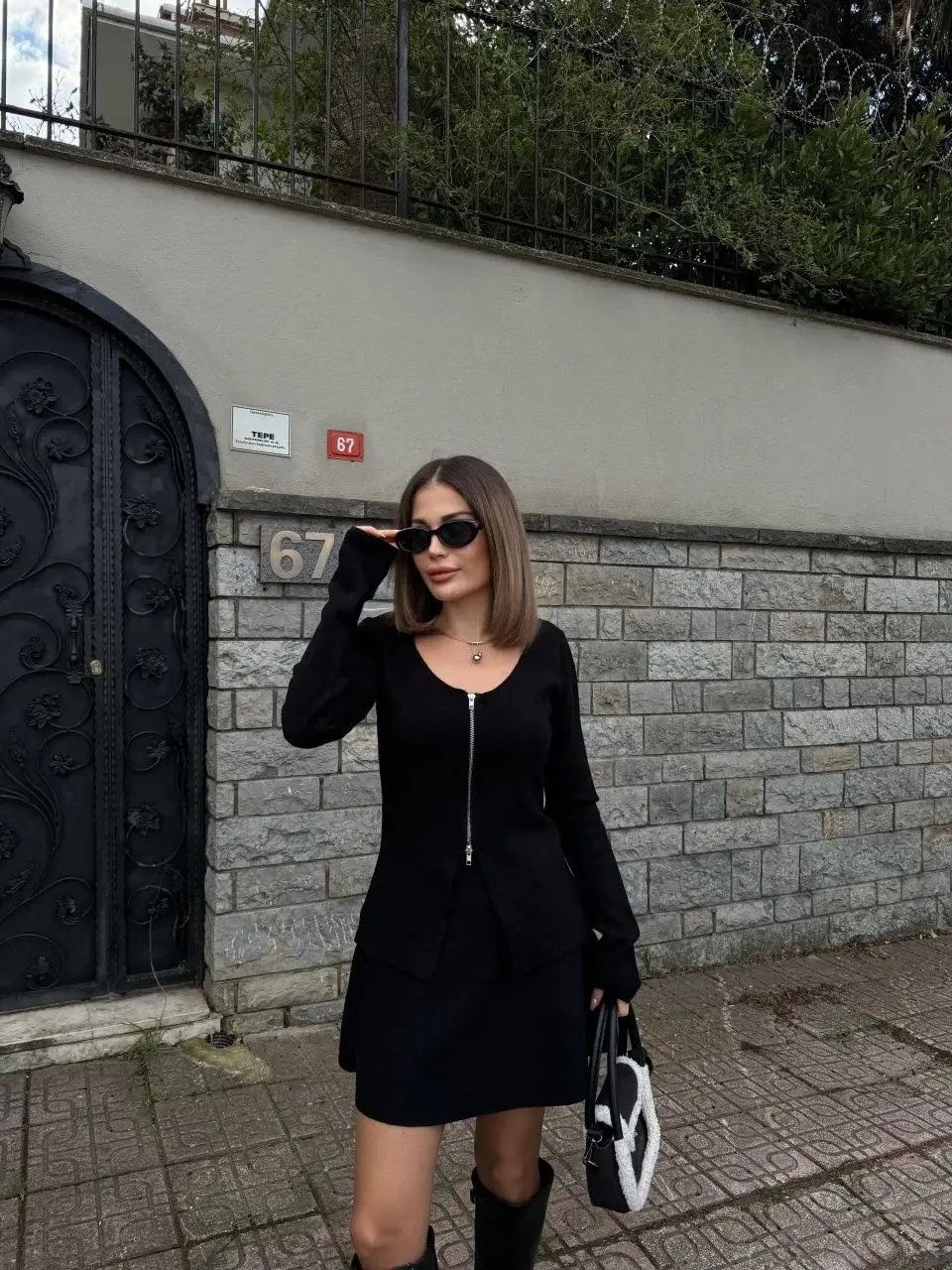 İkili Fermuarlı Hırkalı Etekli Takım - Siyah