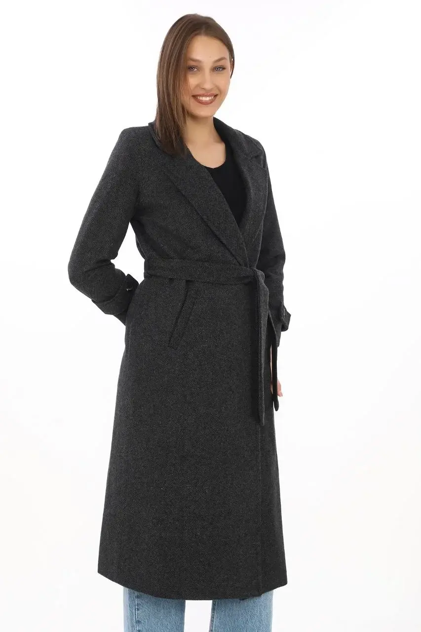 Kadın Astarlı Balık Sırtı Kaşmir Kaşe Kaban - Siyah