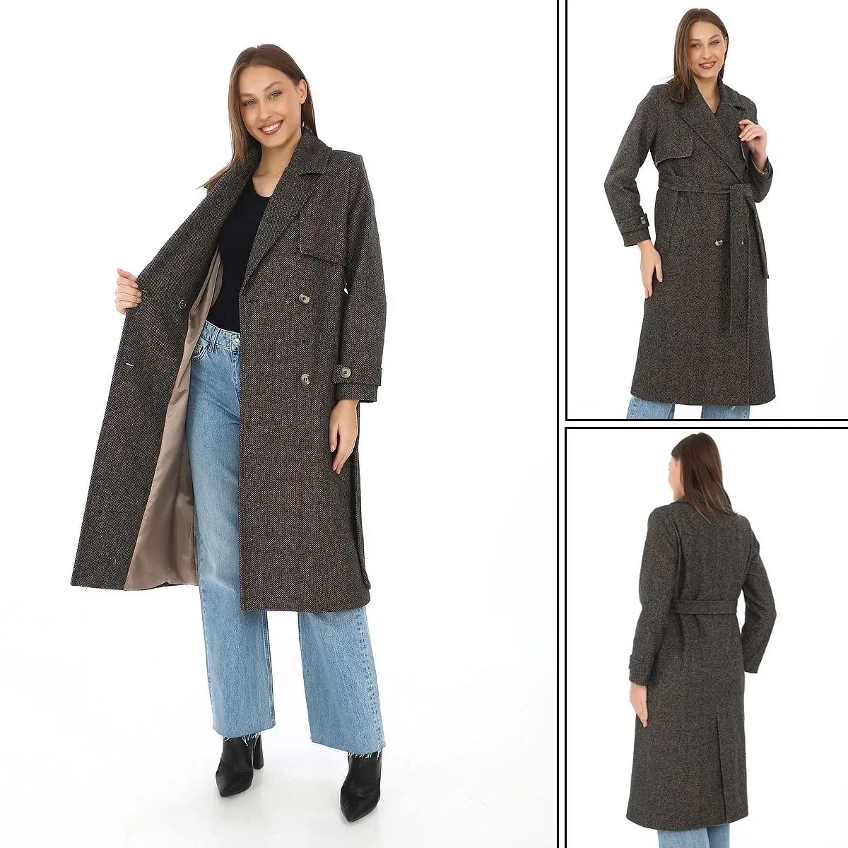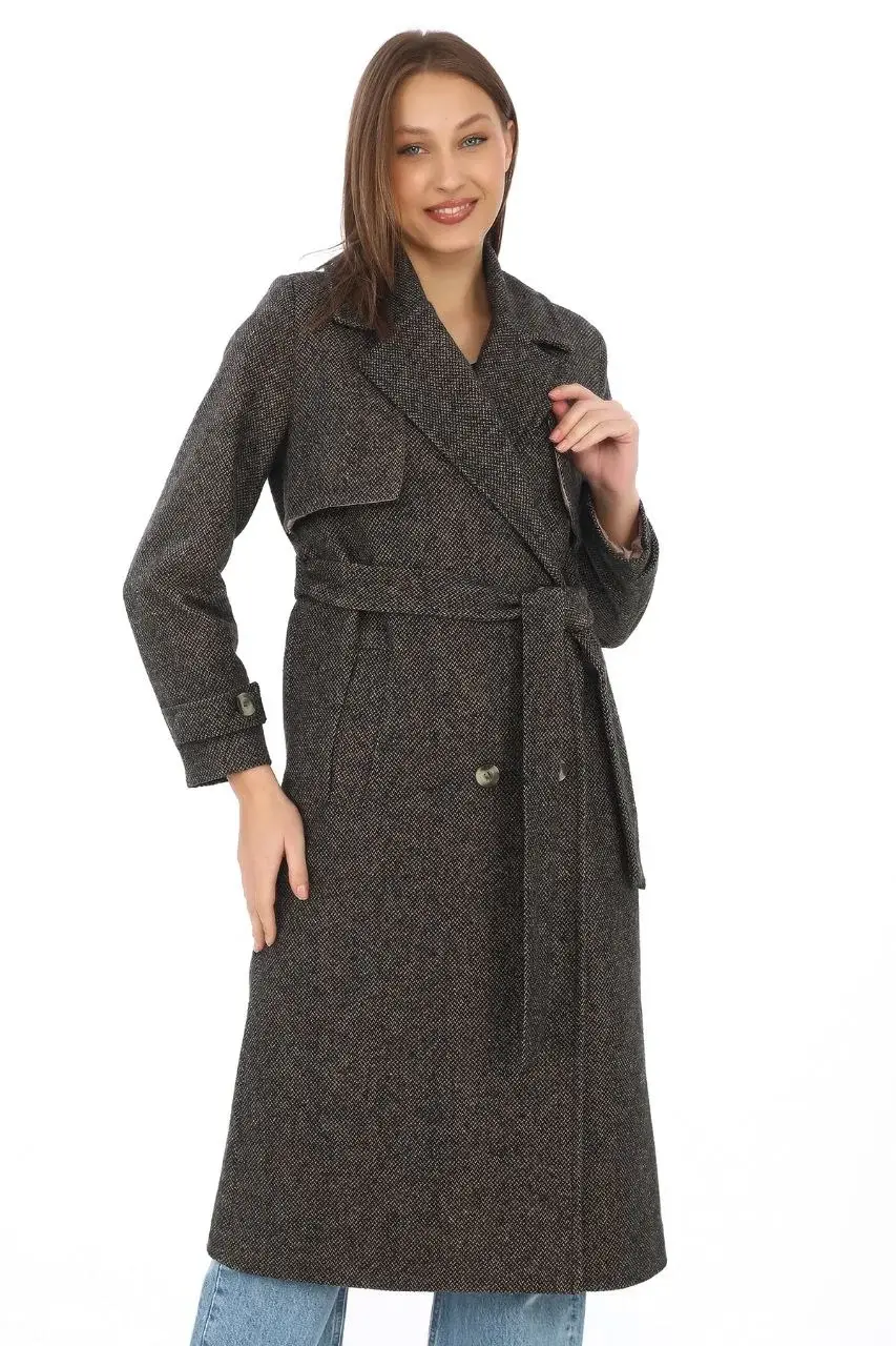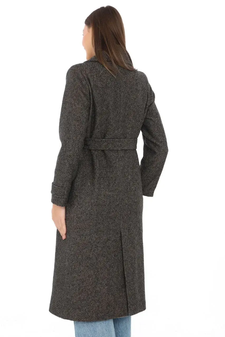 Kadın Balık Sırtı Kaşmir Uzun Kaşe Kaban - Kahverengi