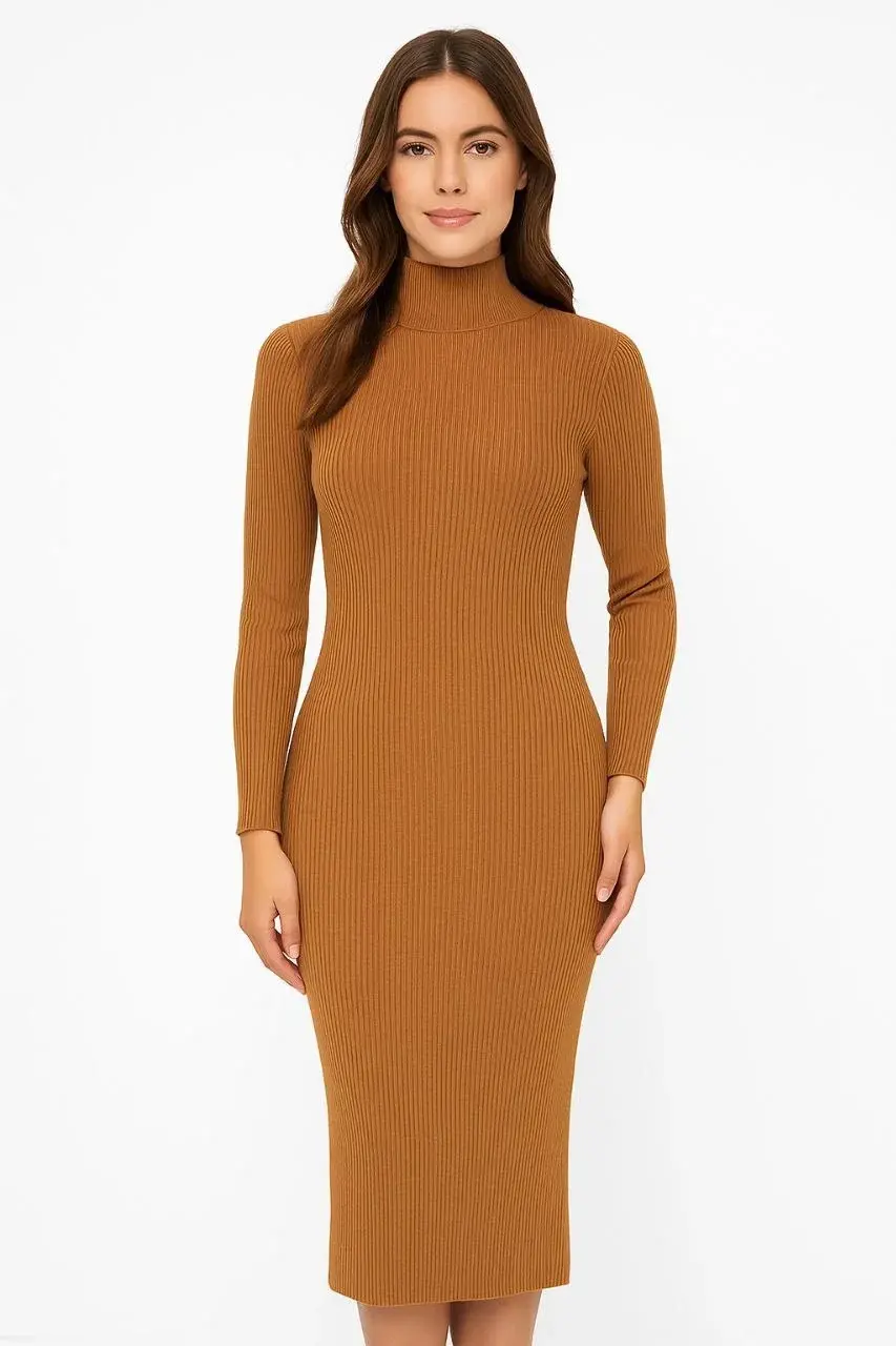Kadın Boğazlı Uzun Fitilli Triko Dokuma Elbise - Kahverengi