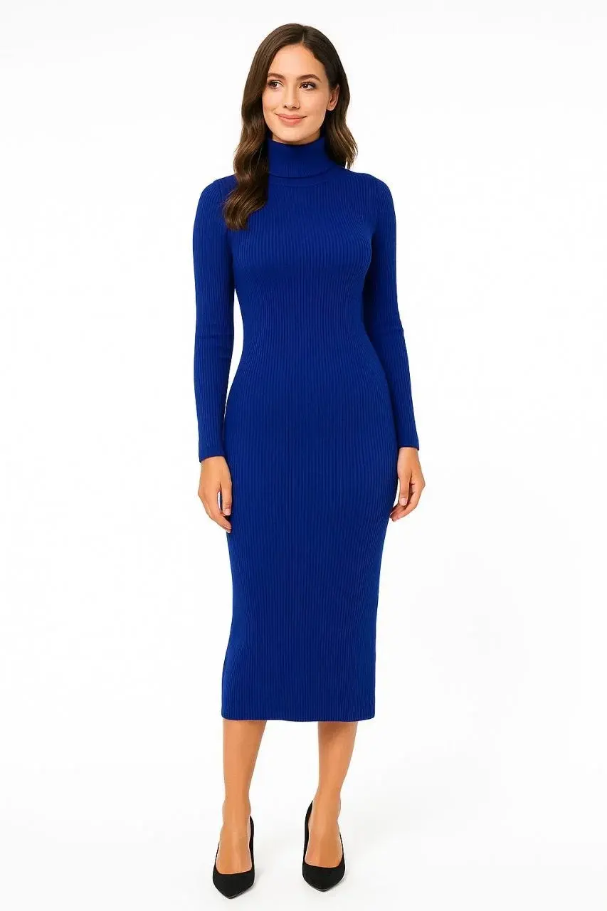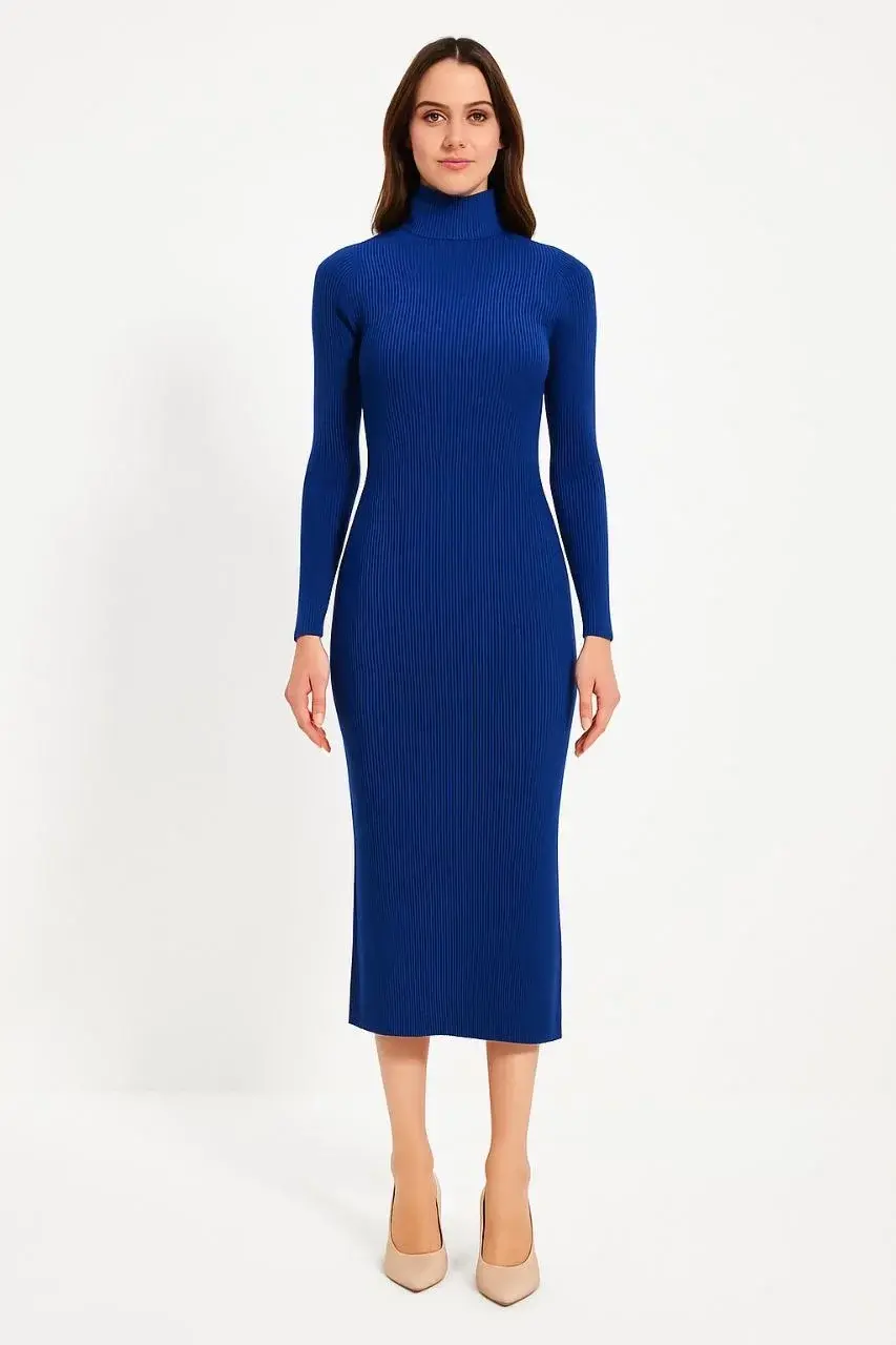 Kadın Boğazlı Uzun Fitilli Triko Dokuma Elbise - Saks Mavisi