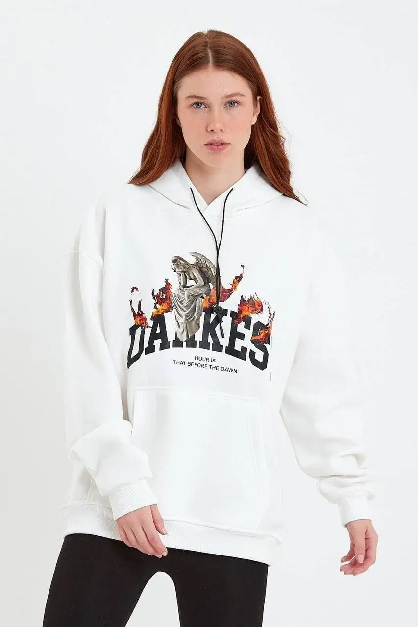 Kadın DANKES Baskılı Kapüşonlu Sweat - Beyaz