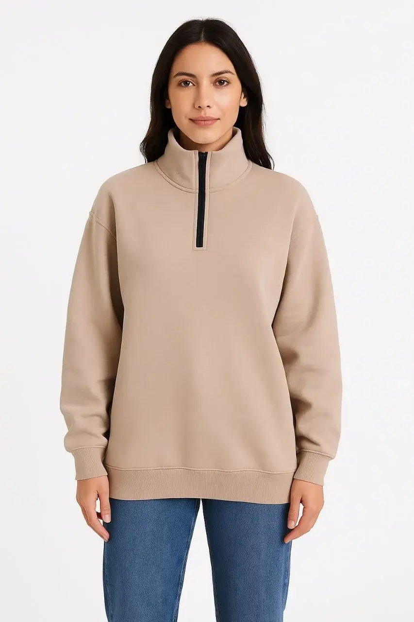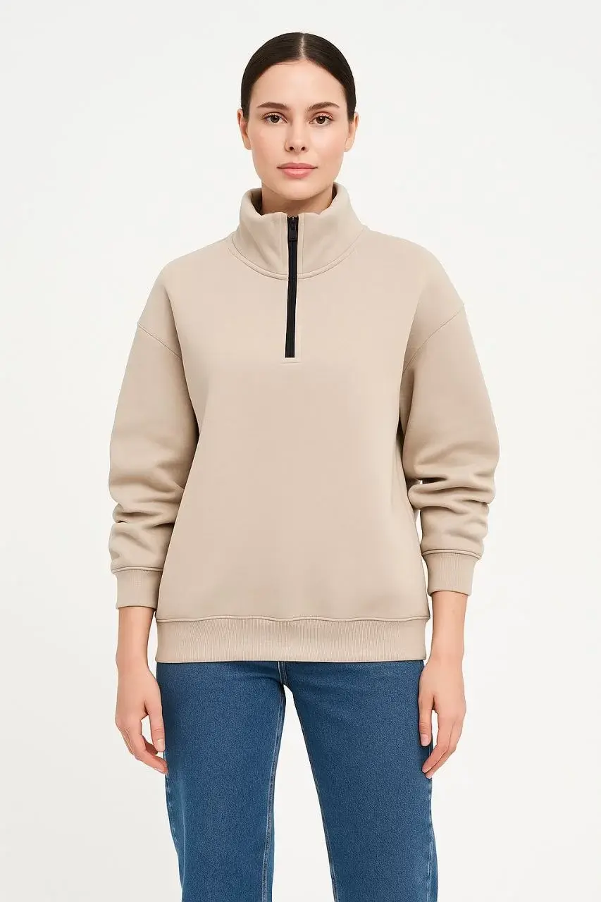 Kadın Üç İplik Dık Yaka Yarım Fermuarlı SweatShirt - Bej