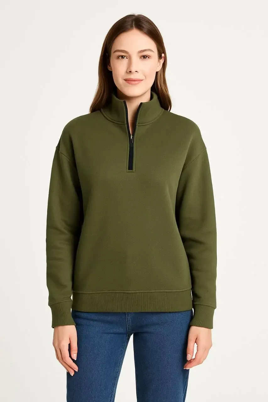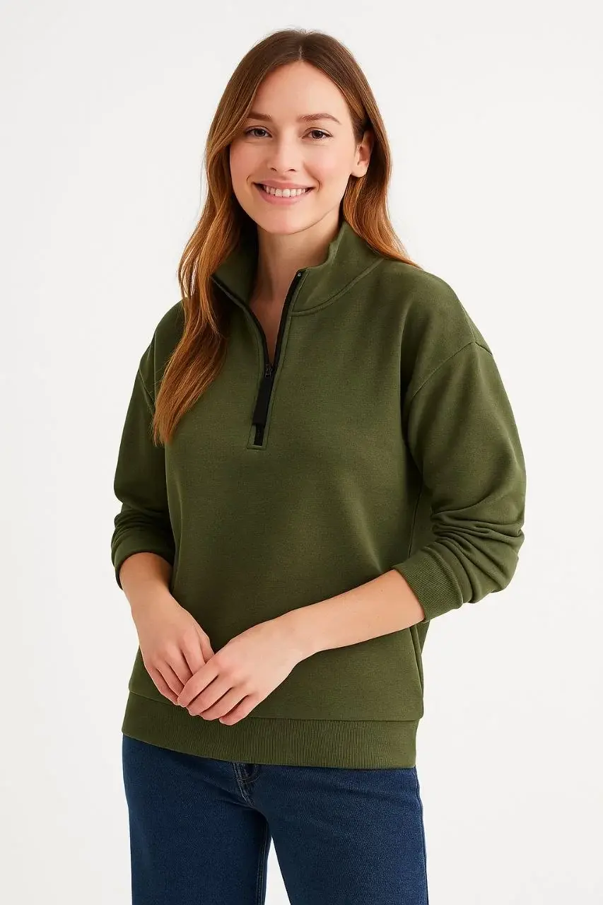 Kadın Üç İplik Dık Yaka Yarım Fermuarlı SweatShirt - Haki