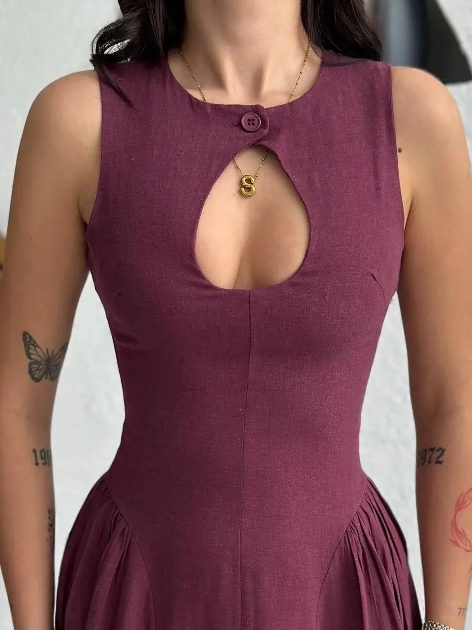 Kolsuz Uzun Gabardin Elbise - Bordo