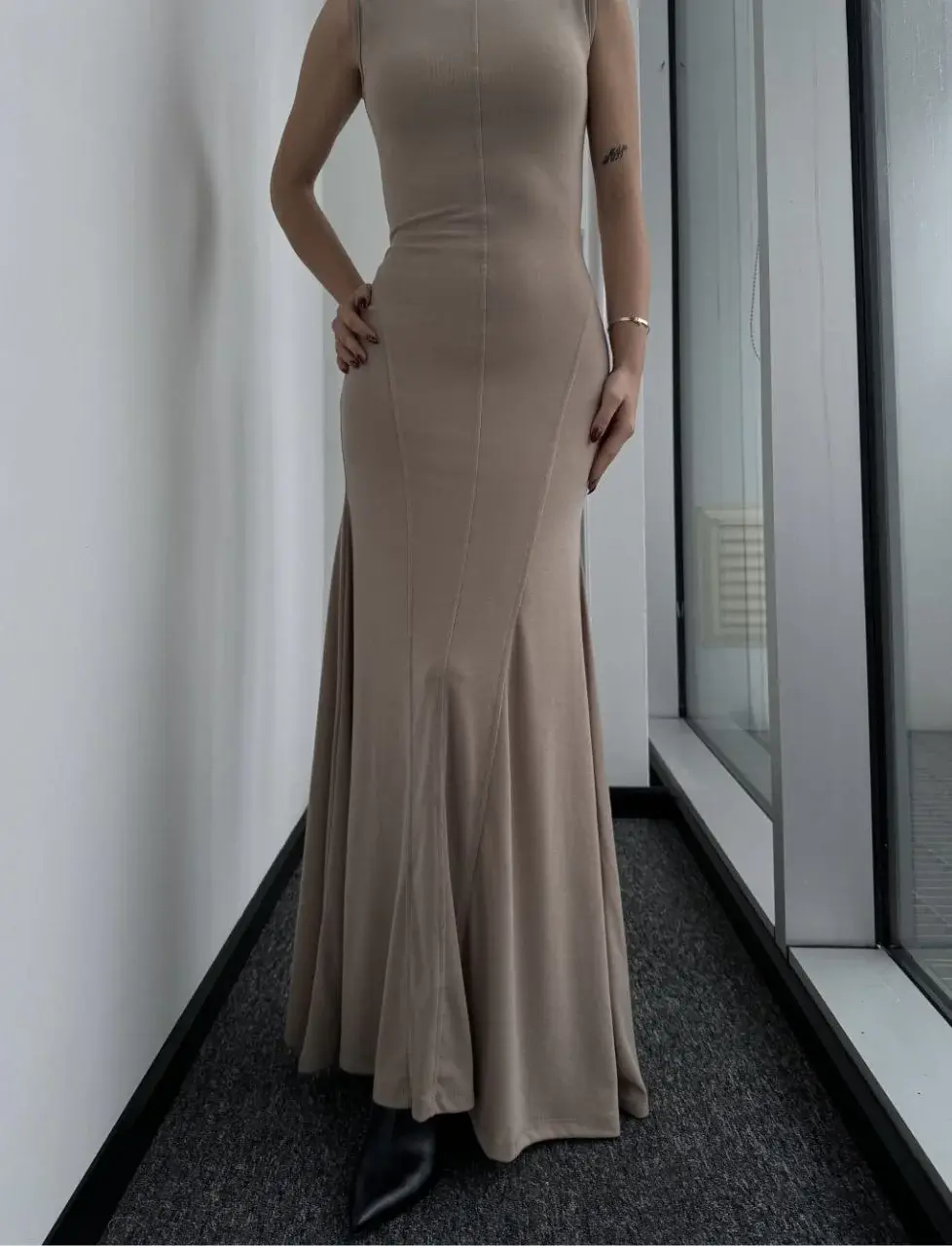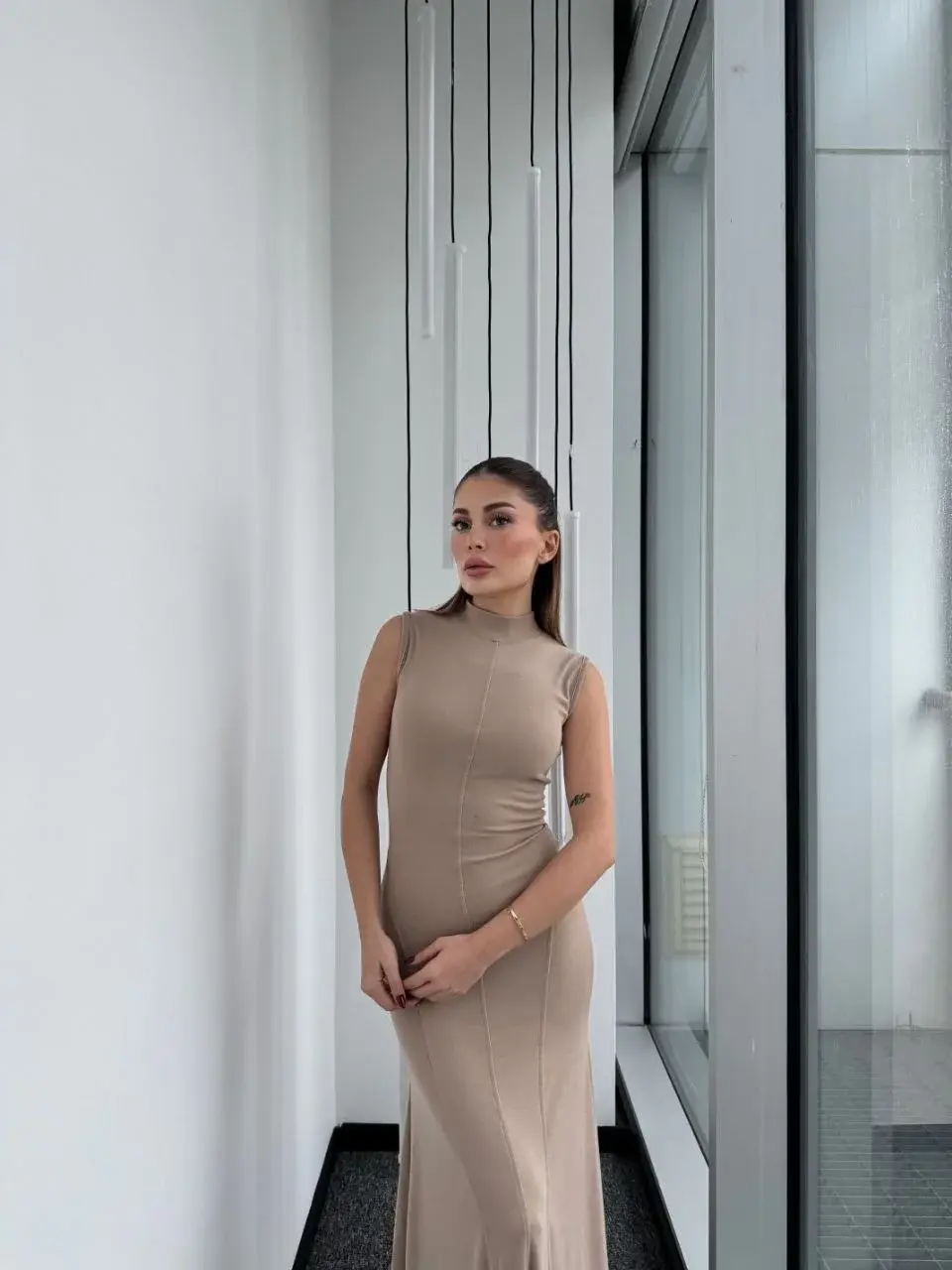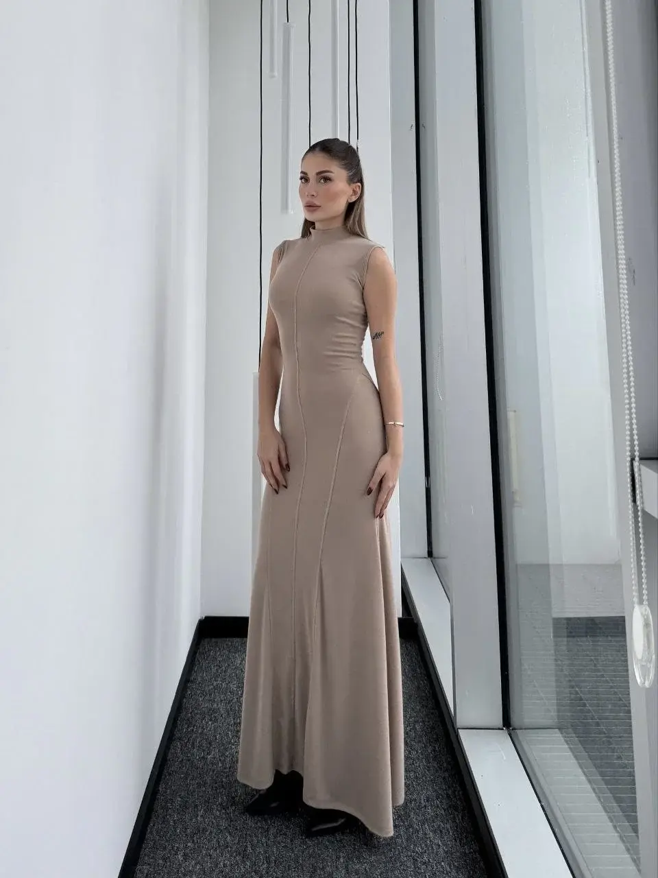 Kolsuz Yarım Bogazlı Uzun Elbise- Bej