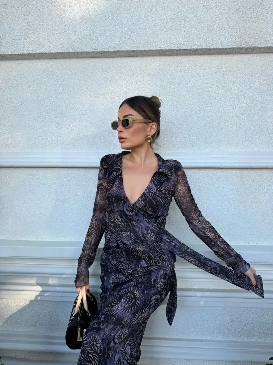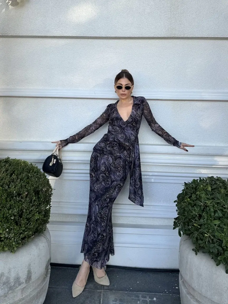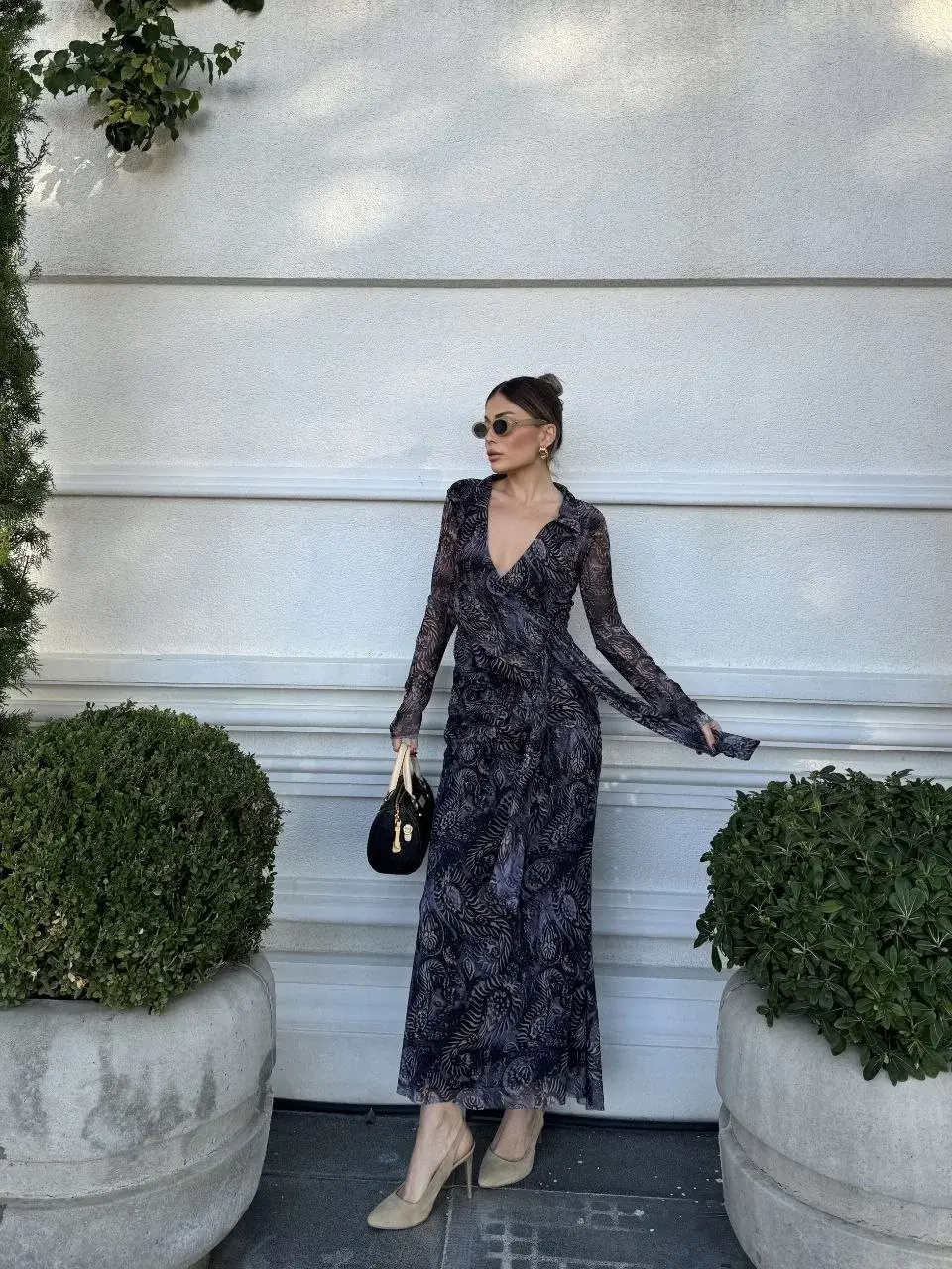 Kruvaze V yaka, fırfırlı ve bağcıklı Desenli Bluz ve Midi Etek Takım - Siyah