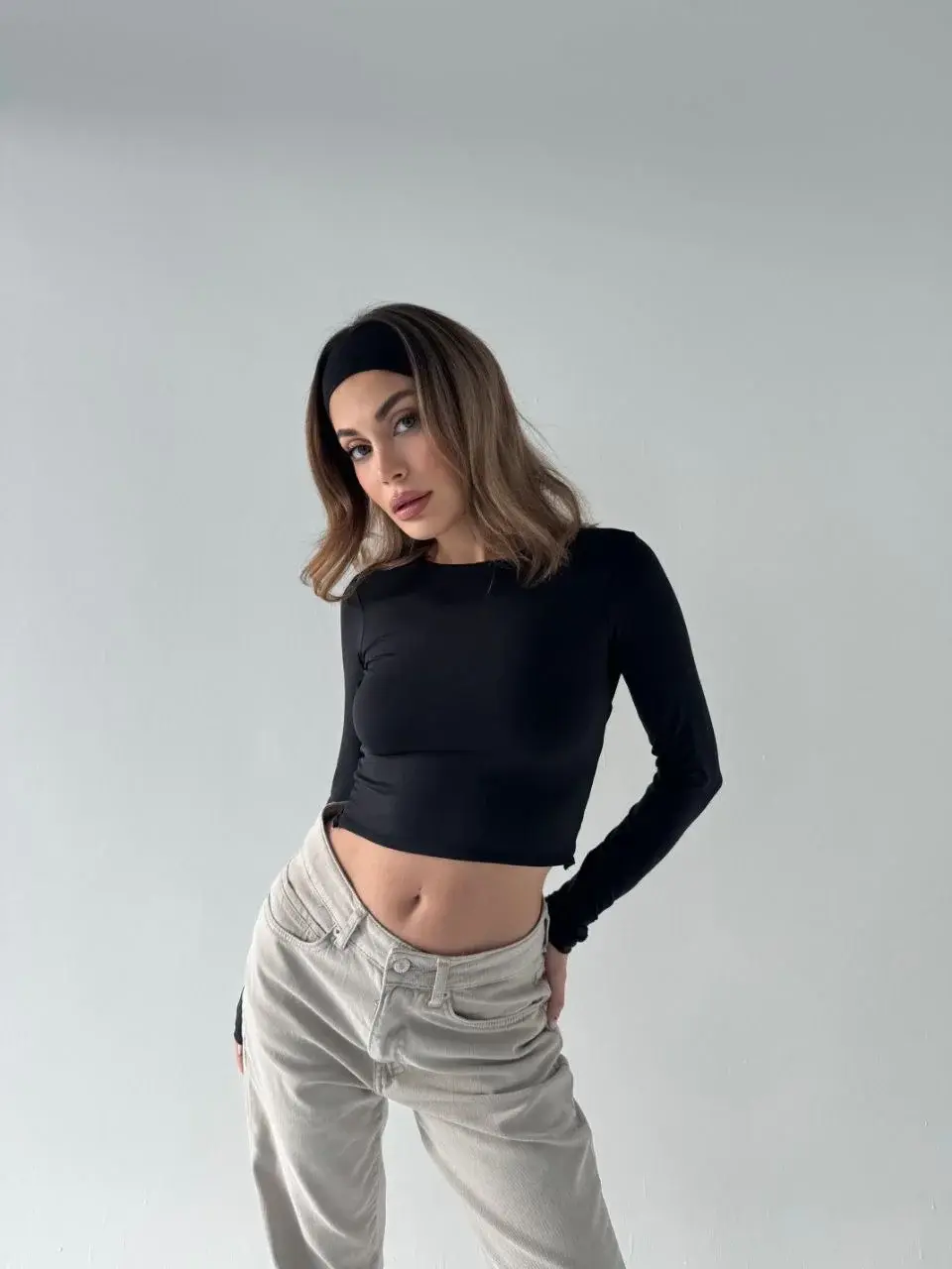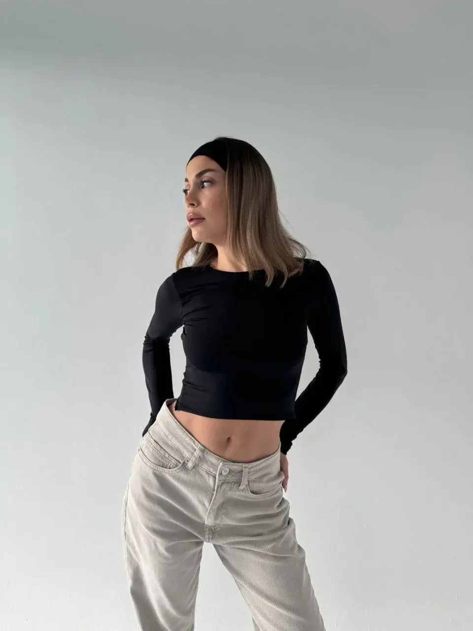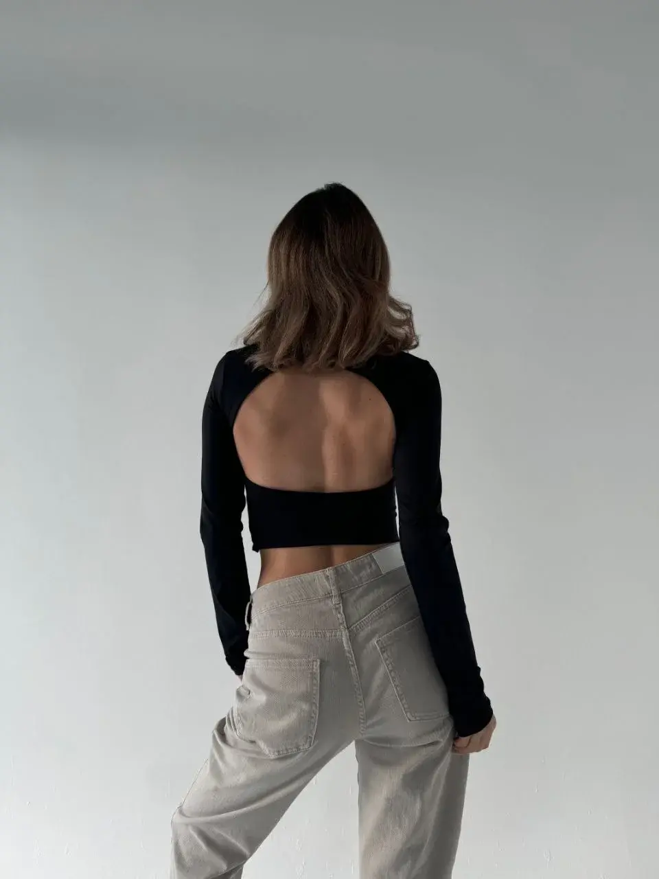 Sırt Dekoltelı Uzun Kollu Crop - Siyah