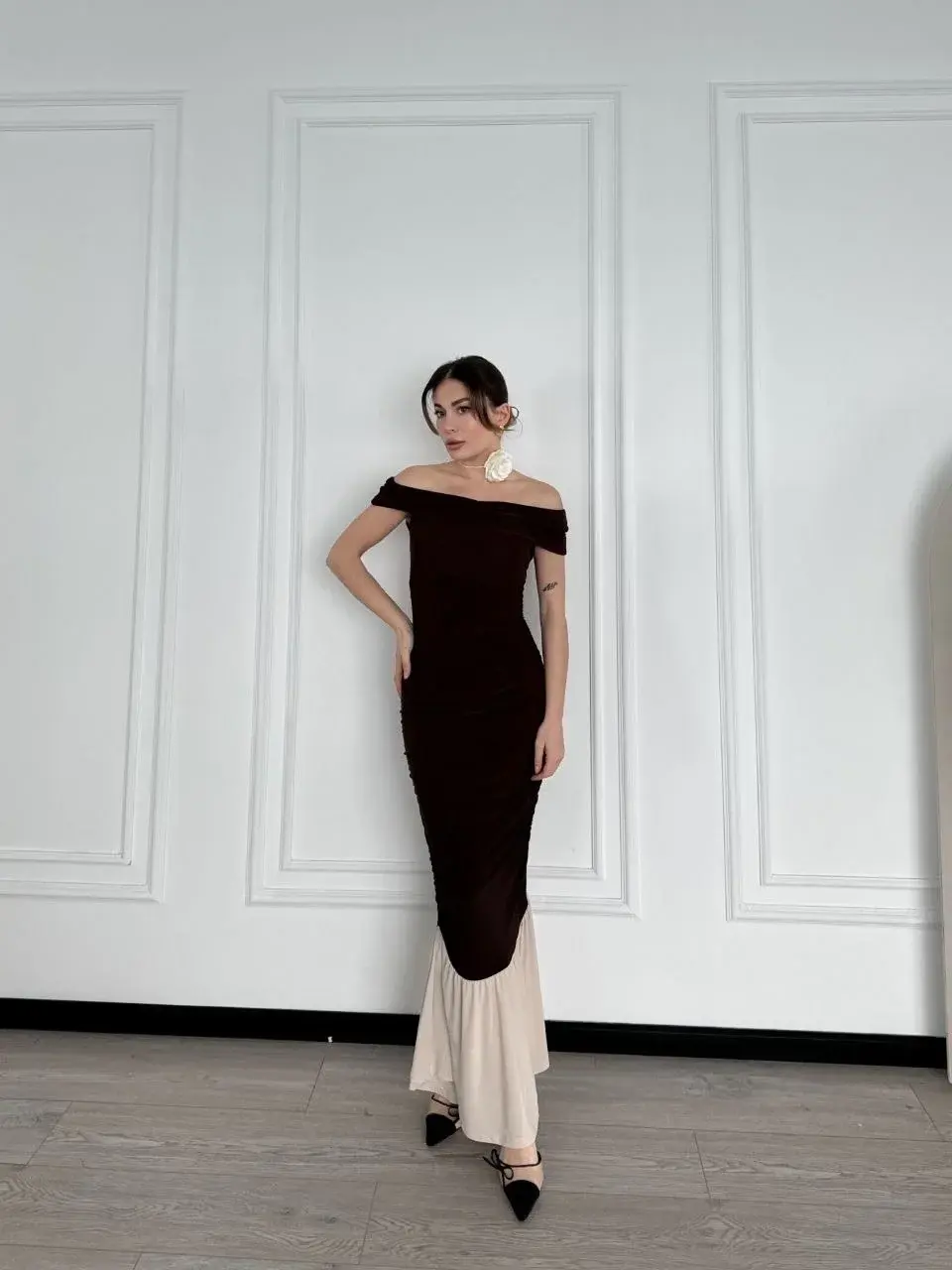 Striptiz Omuzlu Uzun Elbise- Kahve