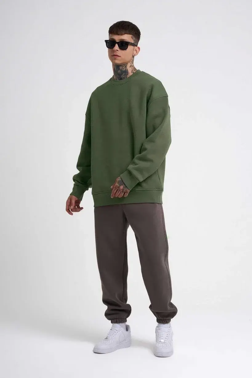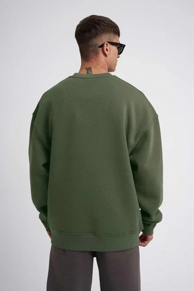 Unisex Biskilet Yaka Üç İplik SweatShirt - Haki