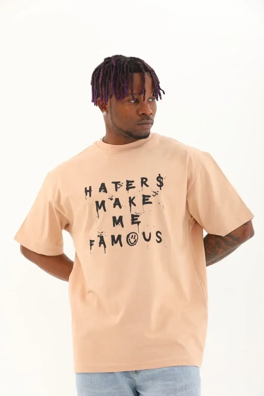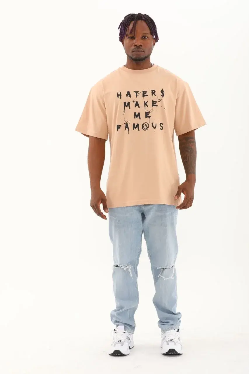 Unisex Oversize Baskılı Bisiklet Yaka T-Shirt - Bej