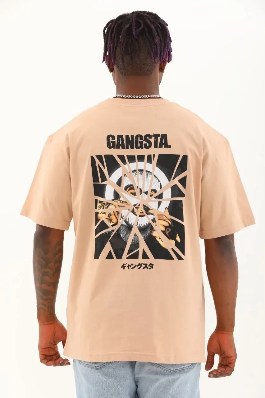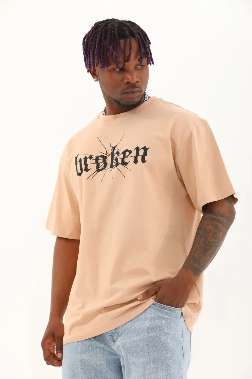 Unisex Oversize Baskılı Bisiklet Yaka T-Shirt - Bej