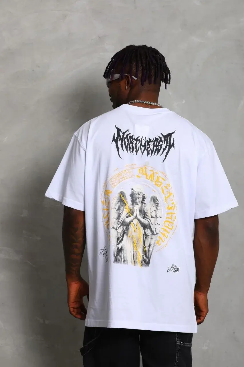 Unisex Oversize Baskılı Bisiklet Yaka T-Shirt - Beyaz