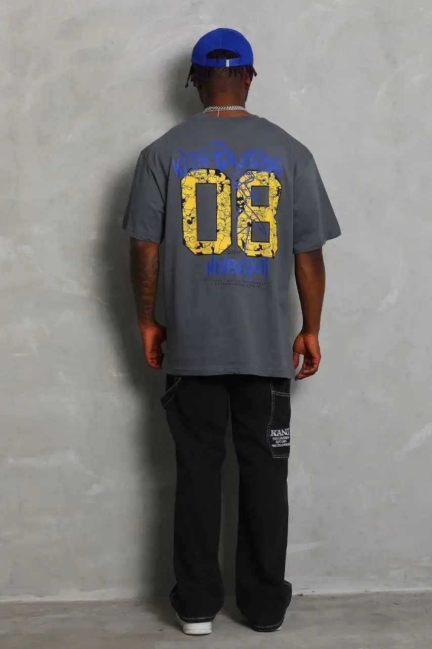Unisex Oversize Baskılı Bisiklet Yaka T-Shirt - Füme