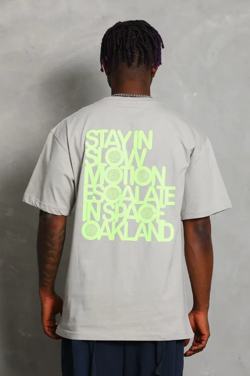 Unisex Oversize Baskılı Bisiklet Yaka T-Shirt - Gri