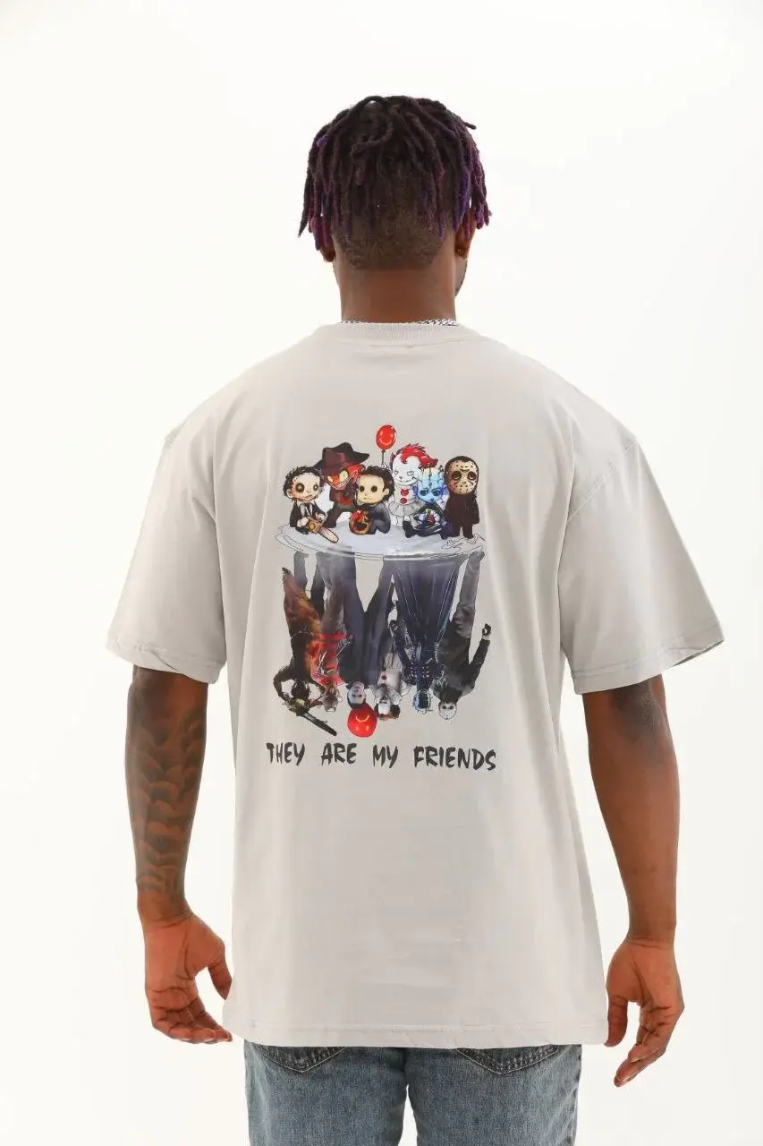 Unisex Oversize Baskılı Bisiklet Yaka T-Shirt - Gri