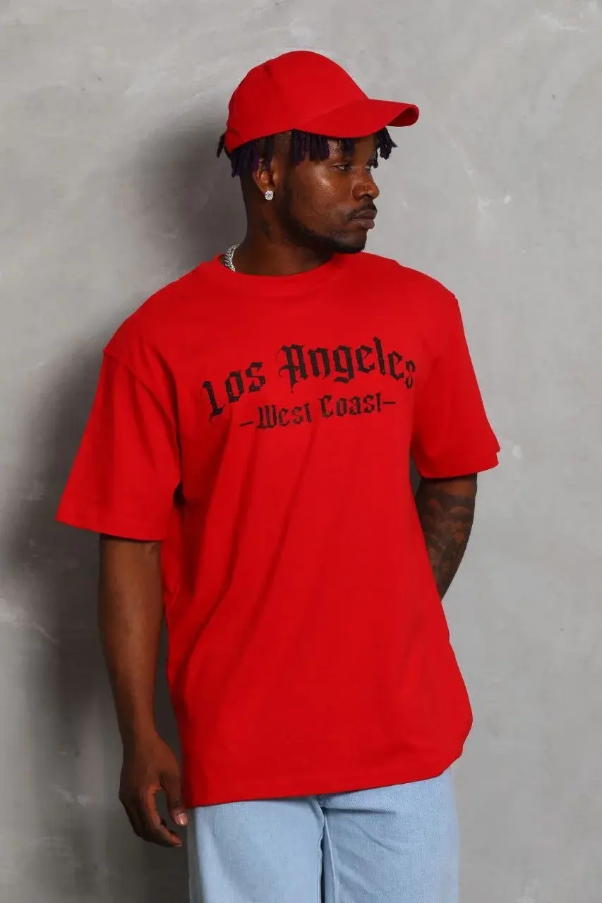 Unisex Oversize Baskılı Bisiklet Yaka T-Shirt - Kırmızı