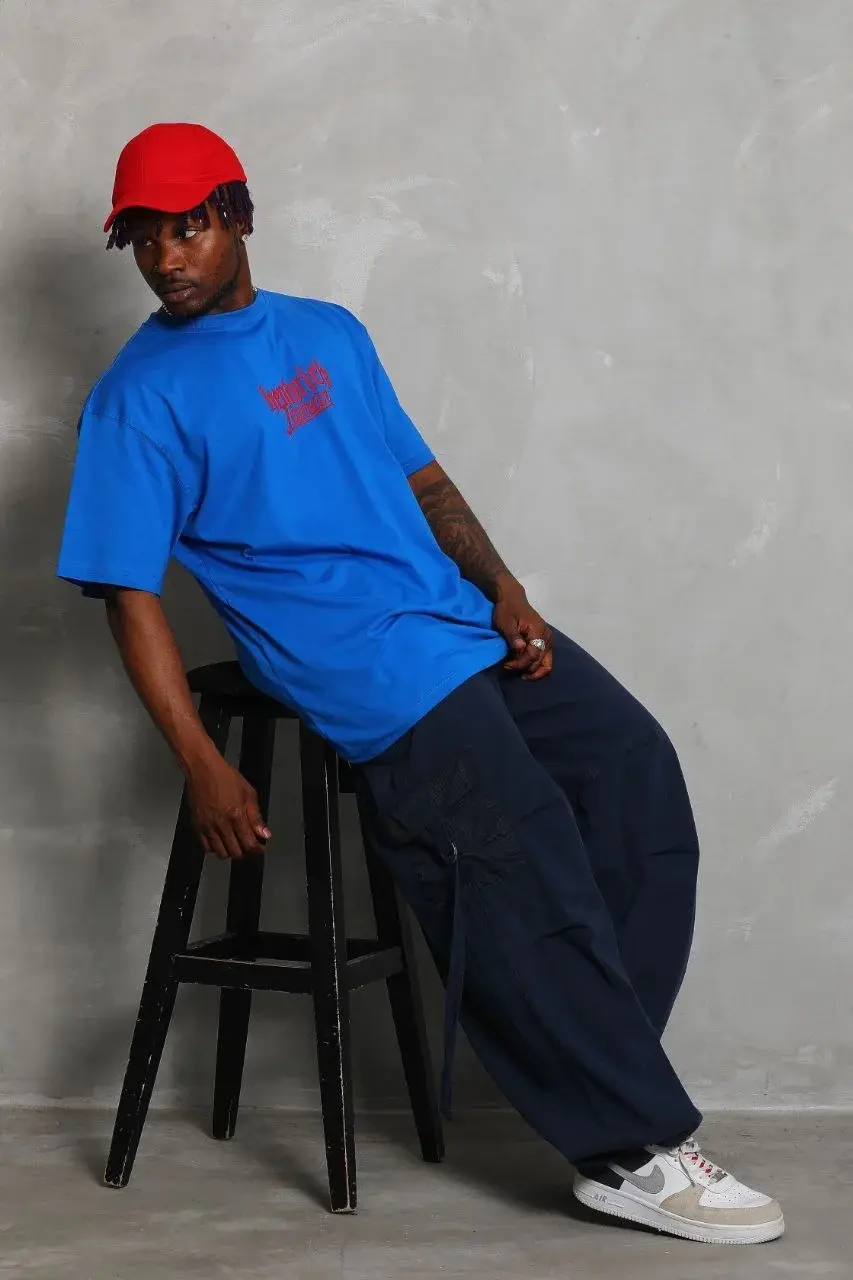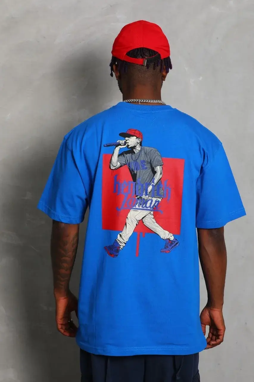Unisex Oversize Baskılı Bisiklet Yaka T-Shirt - Mavi