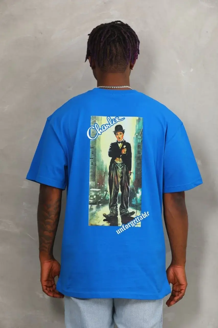 Unisex Oversize Baskılı Bisiklet Yaka T-Shirt - Mavi