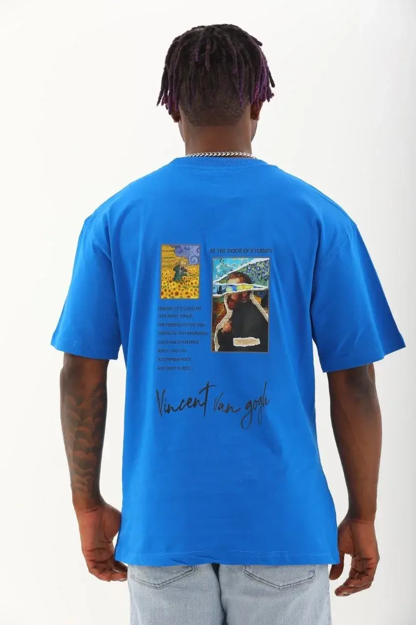 Unisex Oversize Baskılı Bisiklet Yaka T-Shirt - Mavi