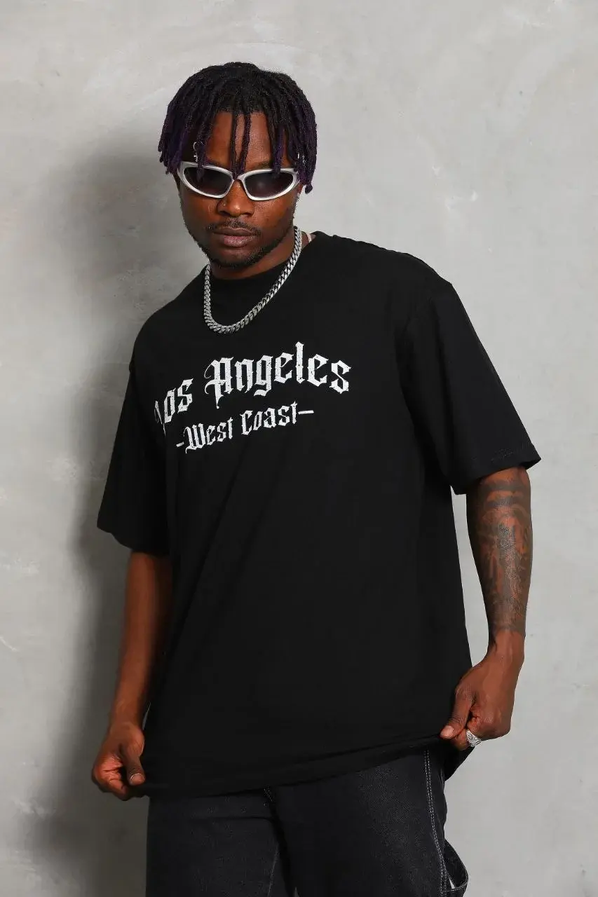 Unisex Oversize Baskılı Bisiklet Yaka T-Shirt - Siyah