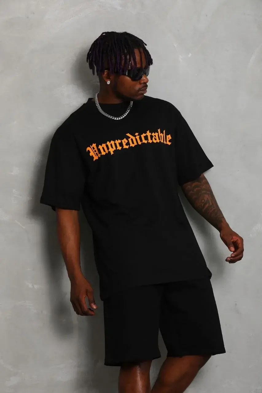 Unisex Oversize Baskılı Bisiklet Yaka T-Shirt - Siyah
