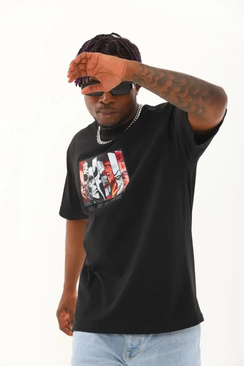 Unisex Oversize Baskılı Bisiklet Yaka T-Shirt - Siyah