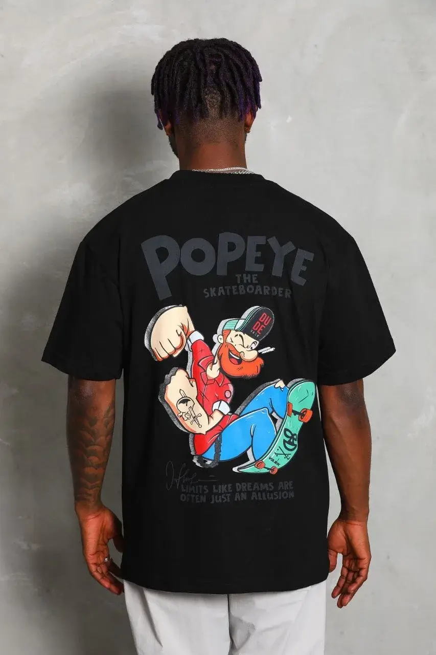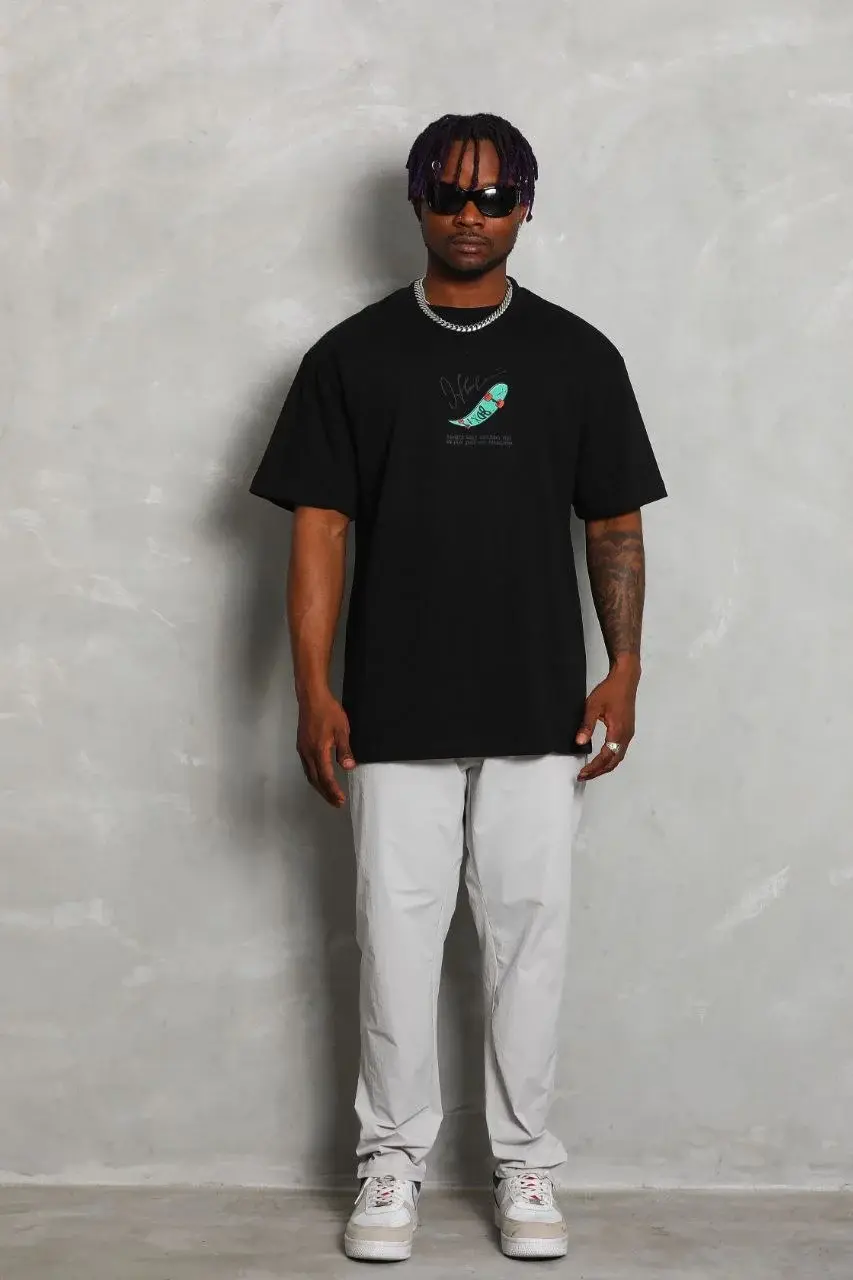 Unisex Oversize Baskılı Bisiklet Yaka T-Shirt - Siyah