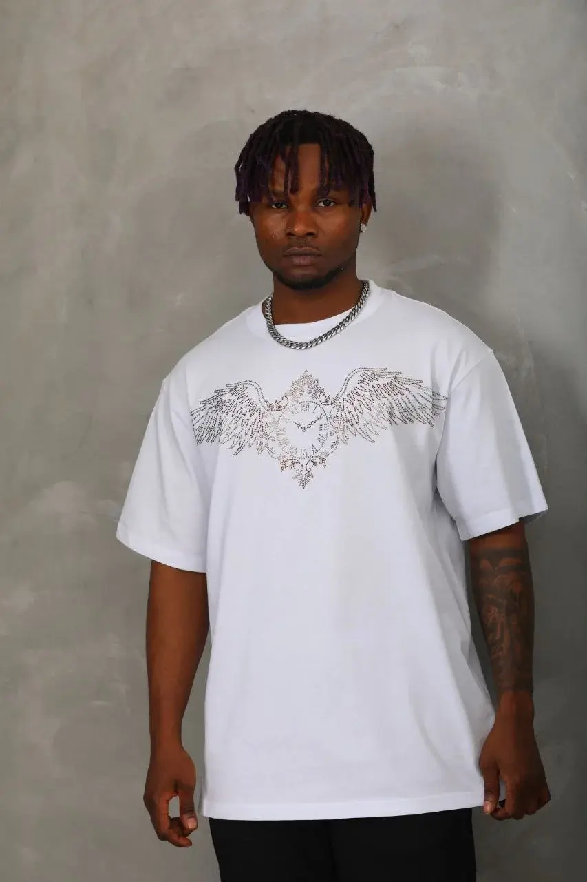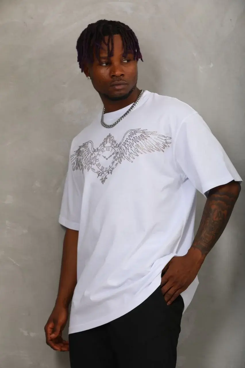 Unisex Oversize Taşlı Bisiklet Yaka T-Shirt - Beyaz