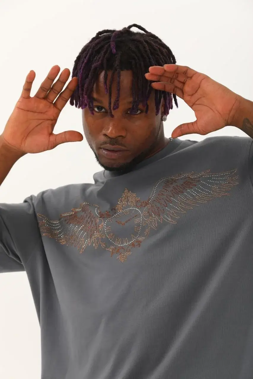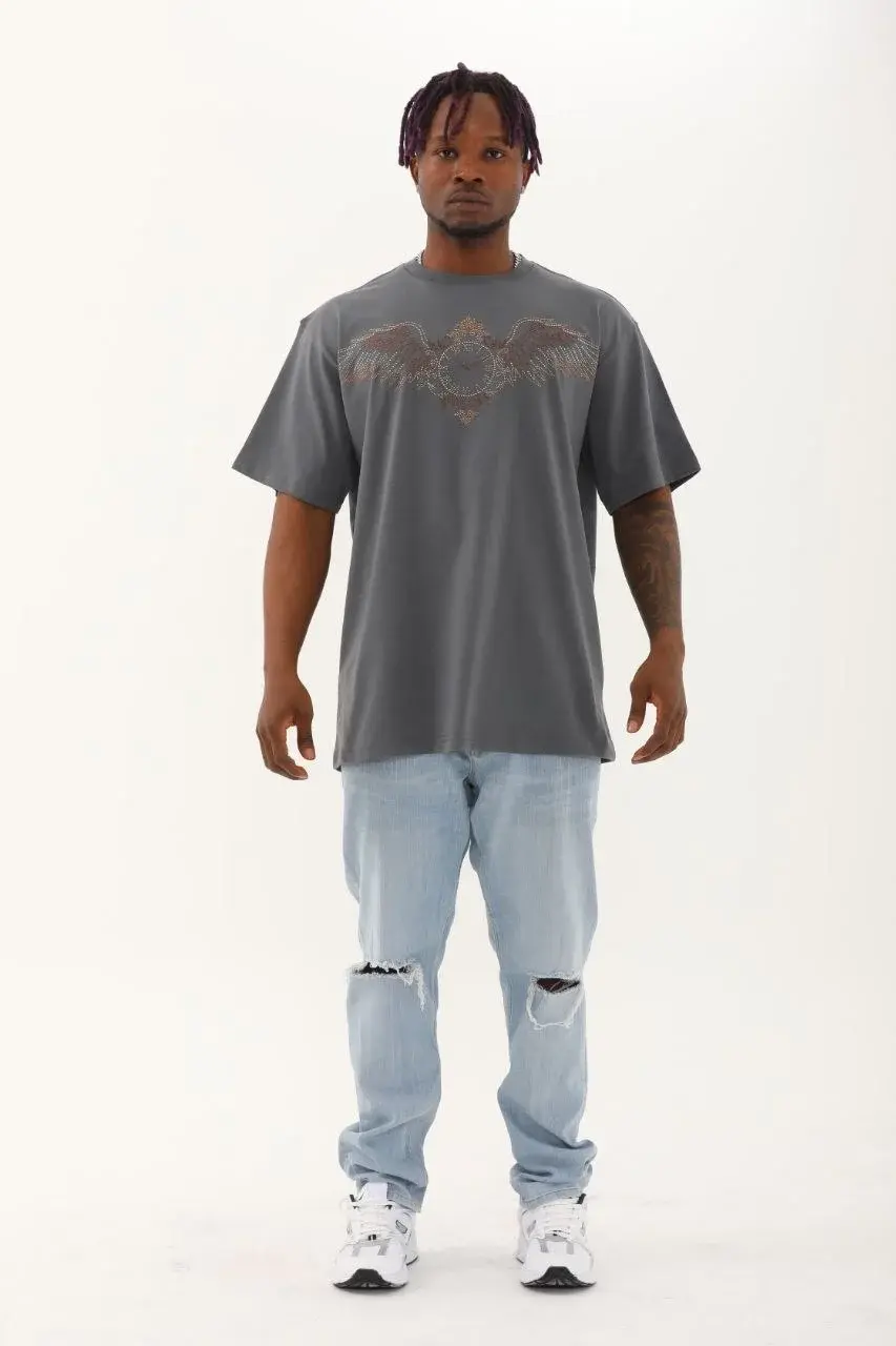 Unisex Oversize Taşlı Bisiklet Yaka T-Shirt - Füme