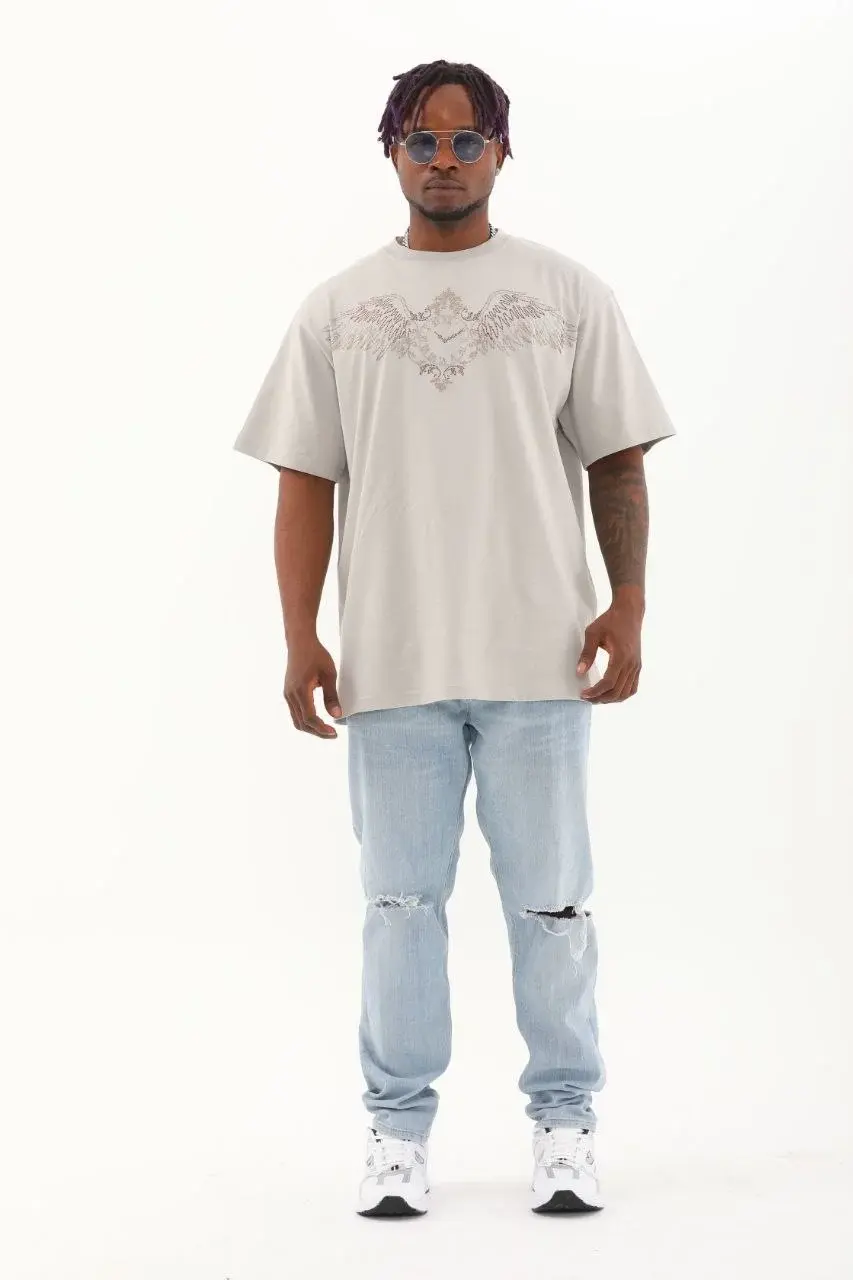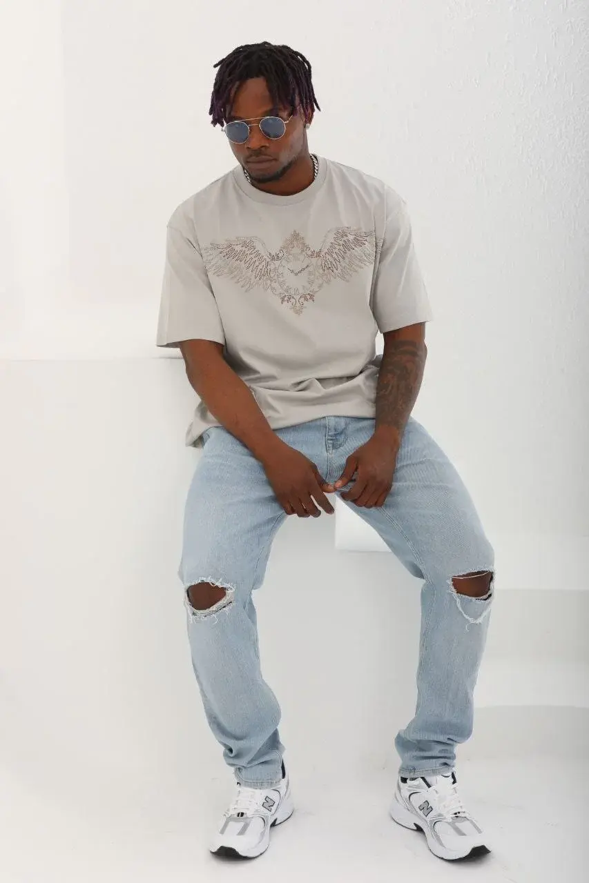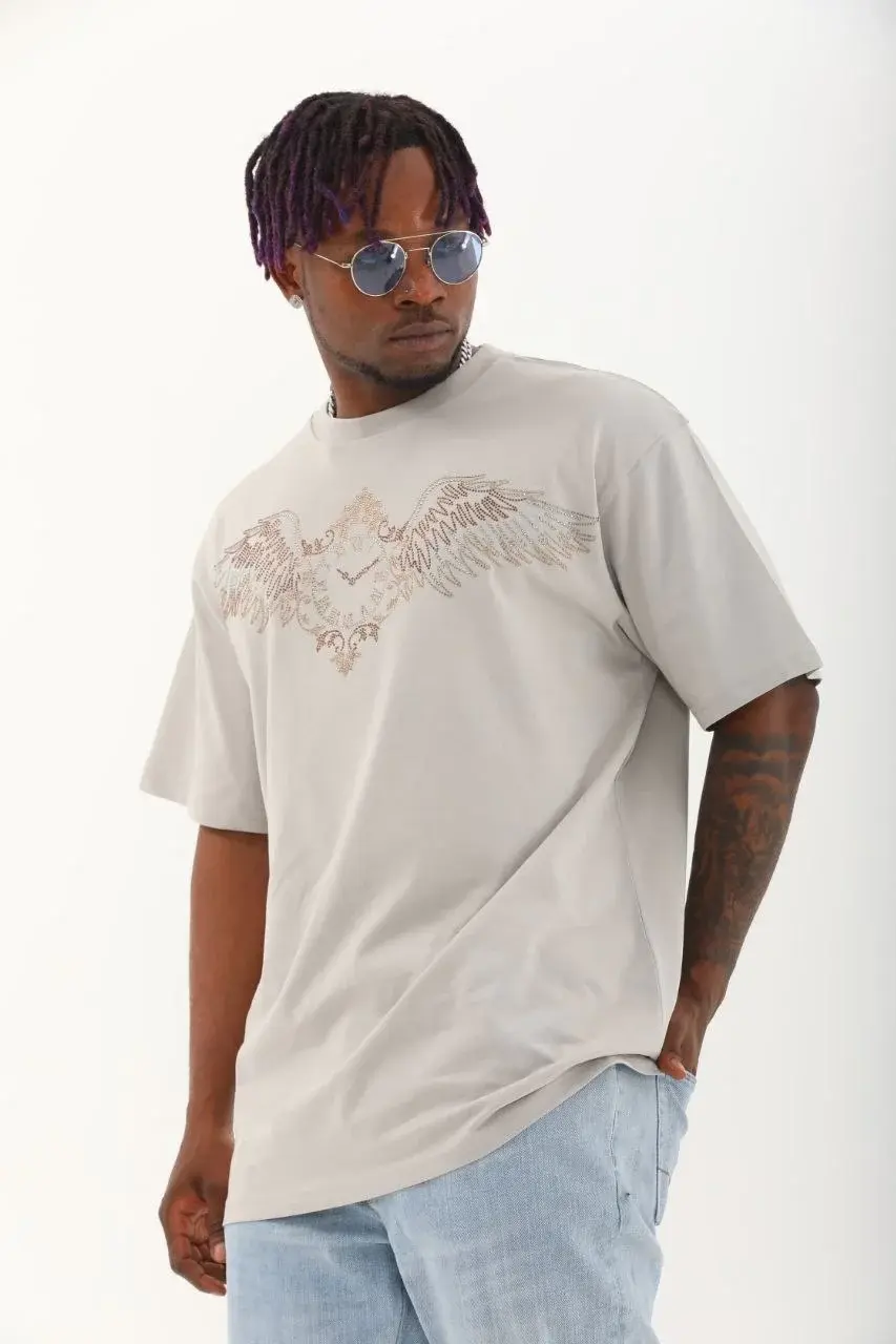 Unisex Oversize Taşlı Bisiklet Yaka T-Shirt - Gri