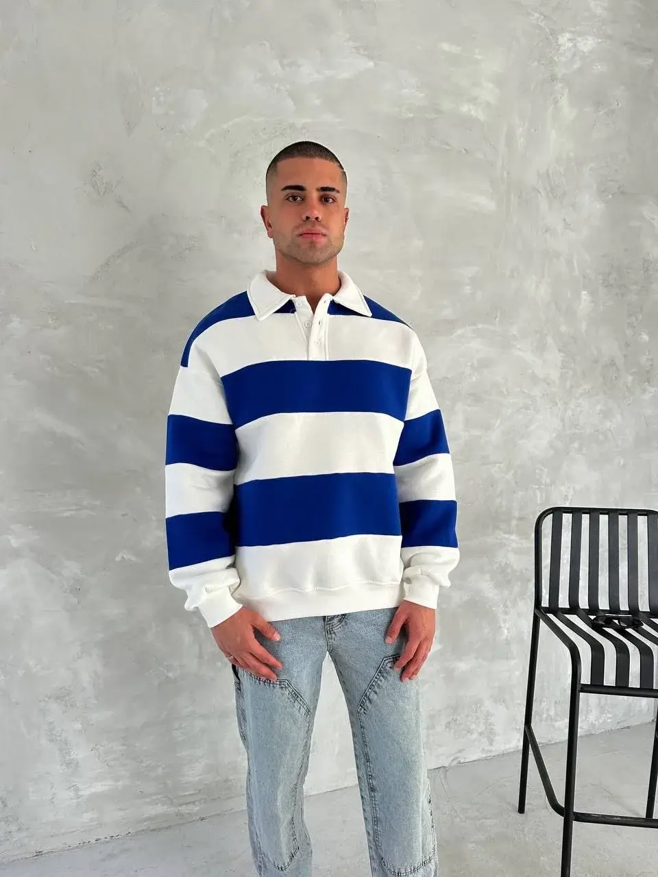Unisex Üç İplik Parçalı Yakalı SweatShirt - Mavi