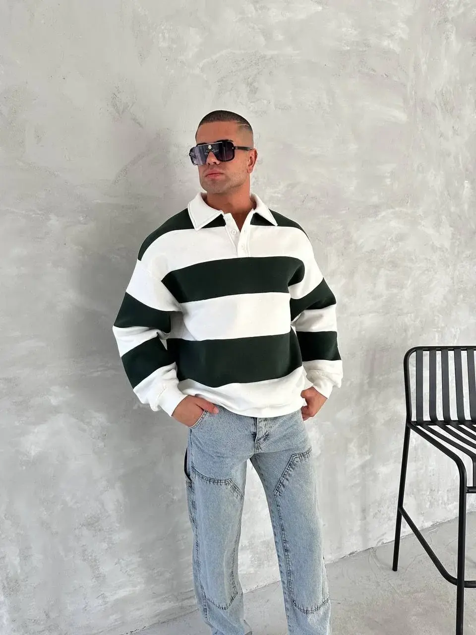 Unisex Üç İplik Parçalı Yakalı SweatShirt - Yeşil