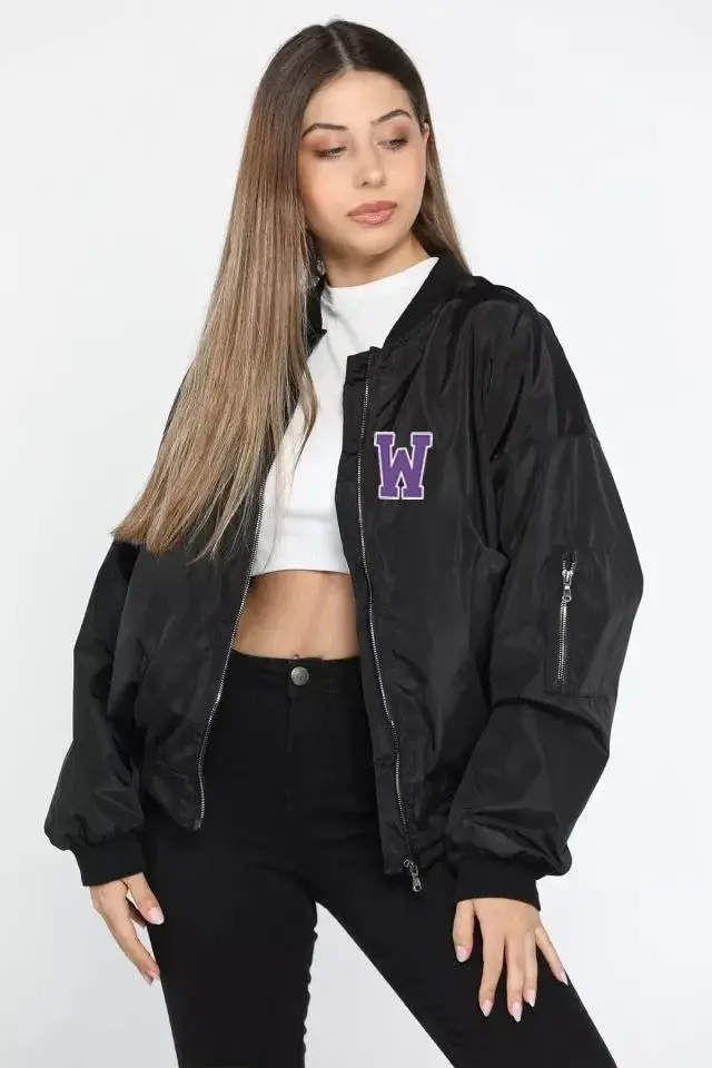 Unisex Uzun Kol Baskılı Bomber Ceket - Siyah