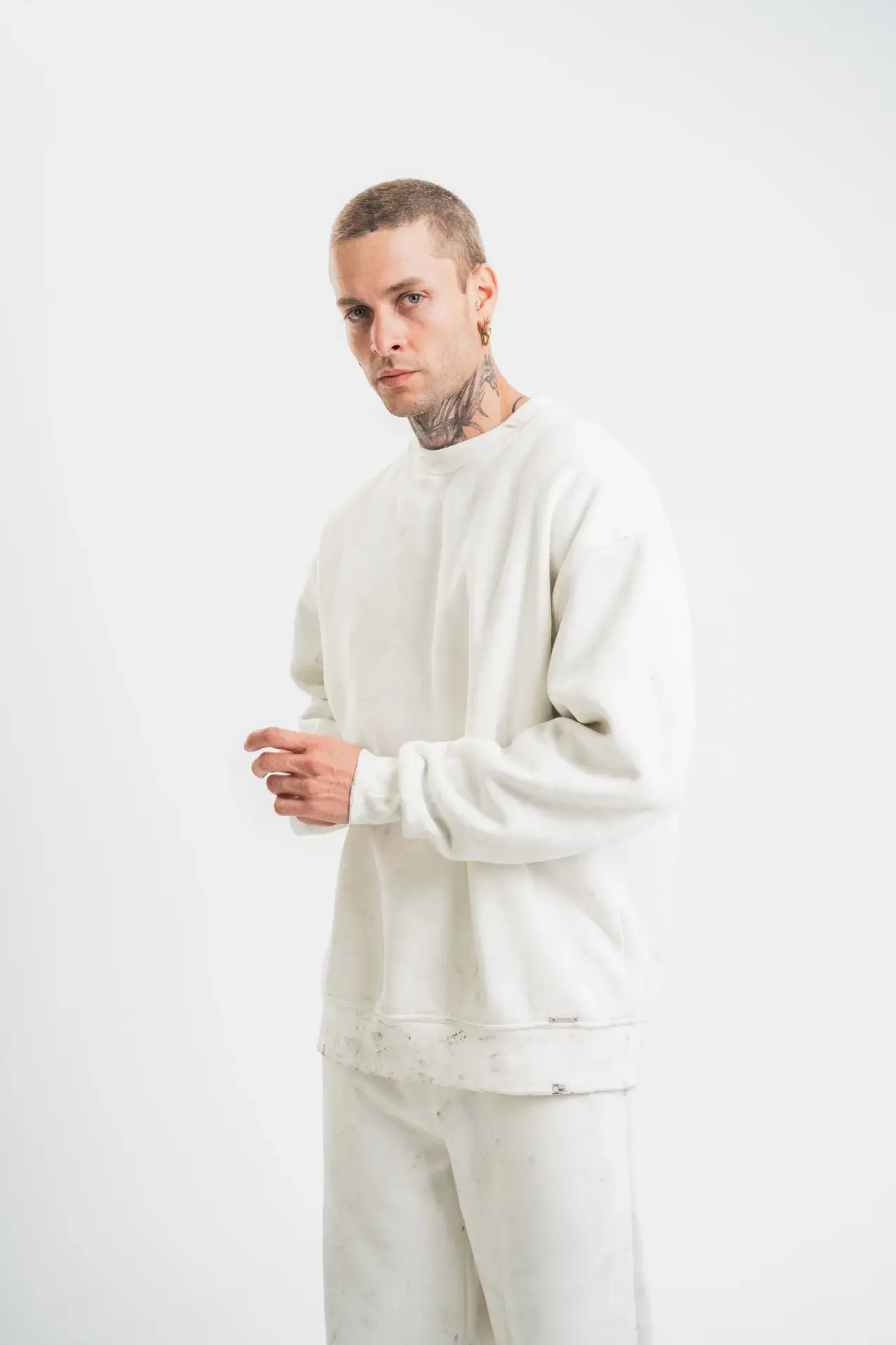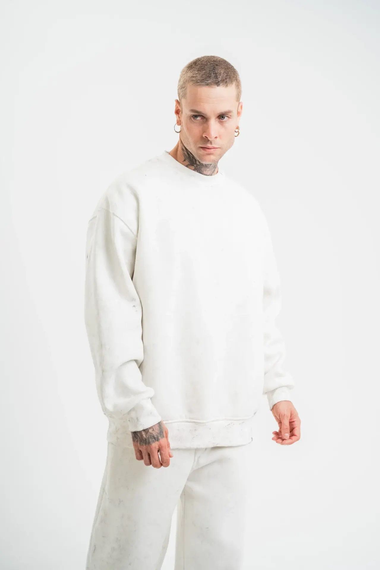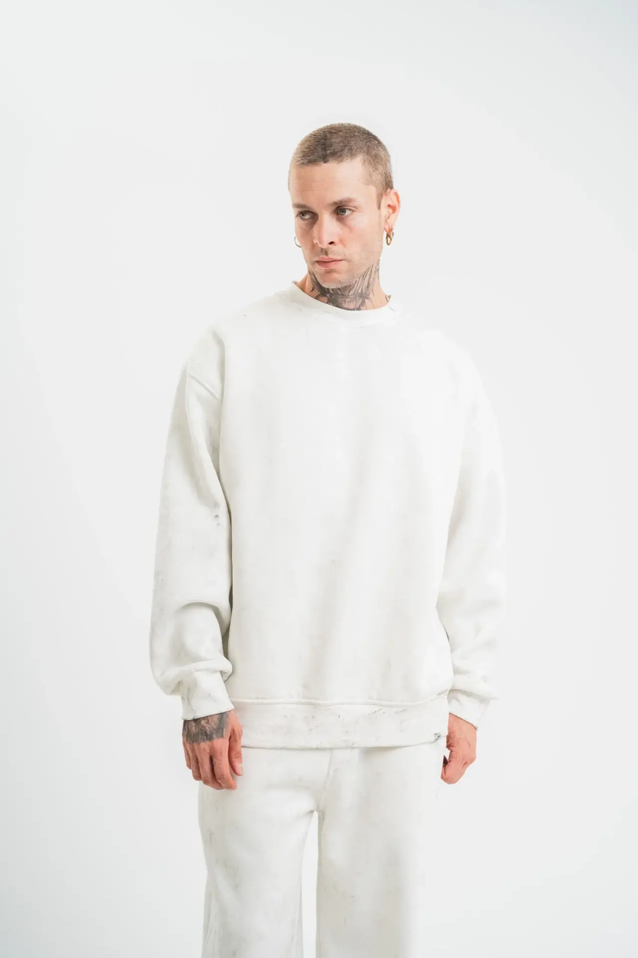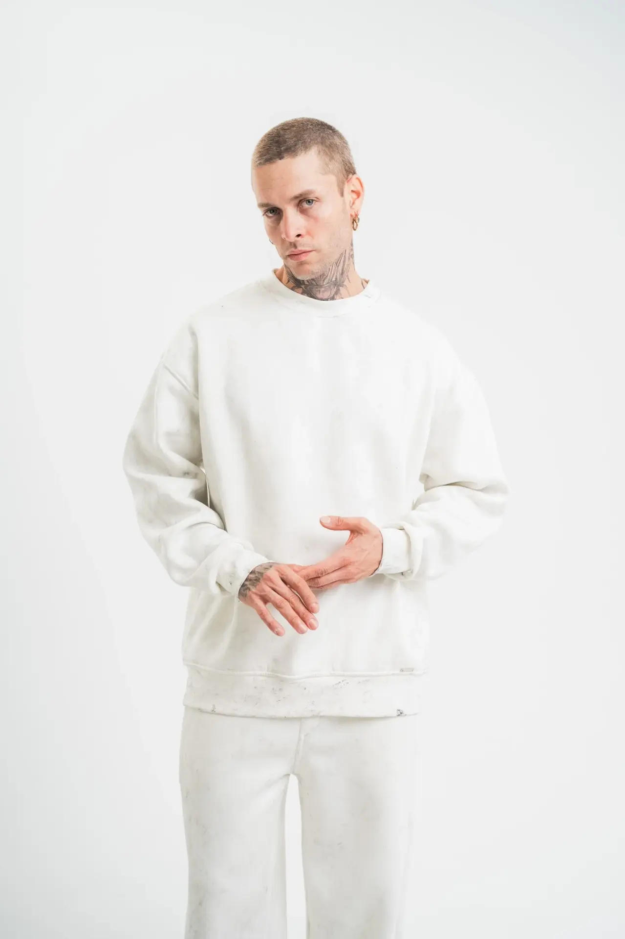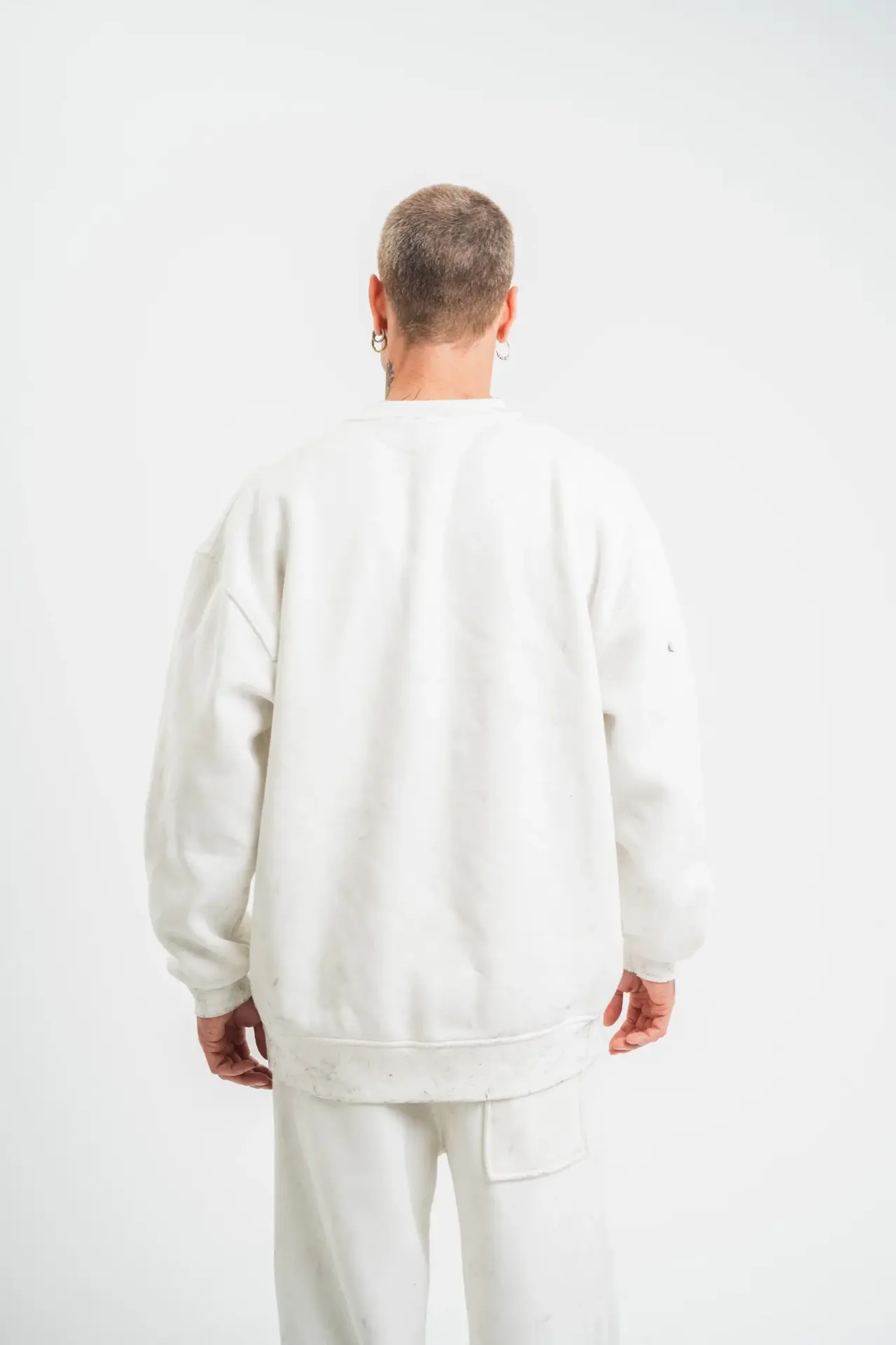 Unisex Uzun Kol Bisiklet Yaka Yıkamalı SweatShirt - Beyaz