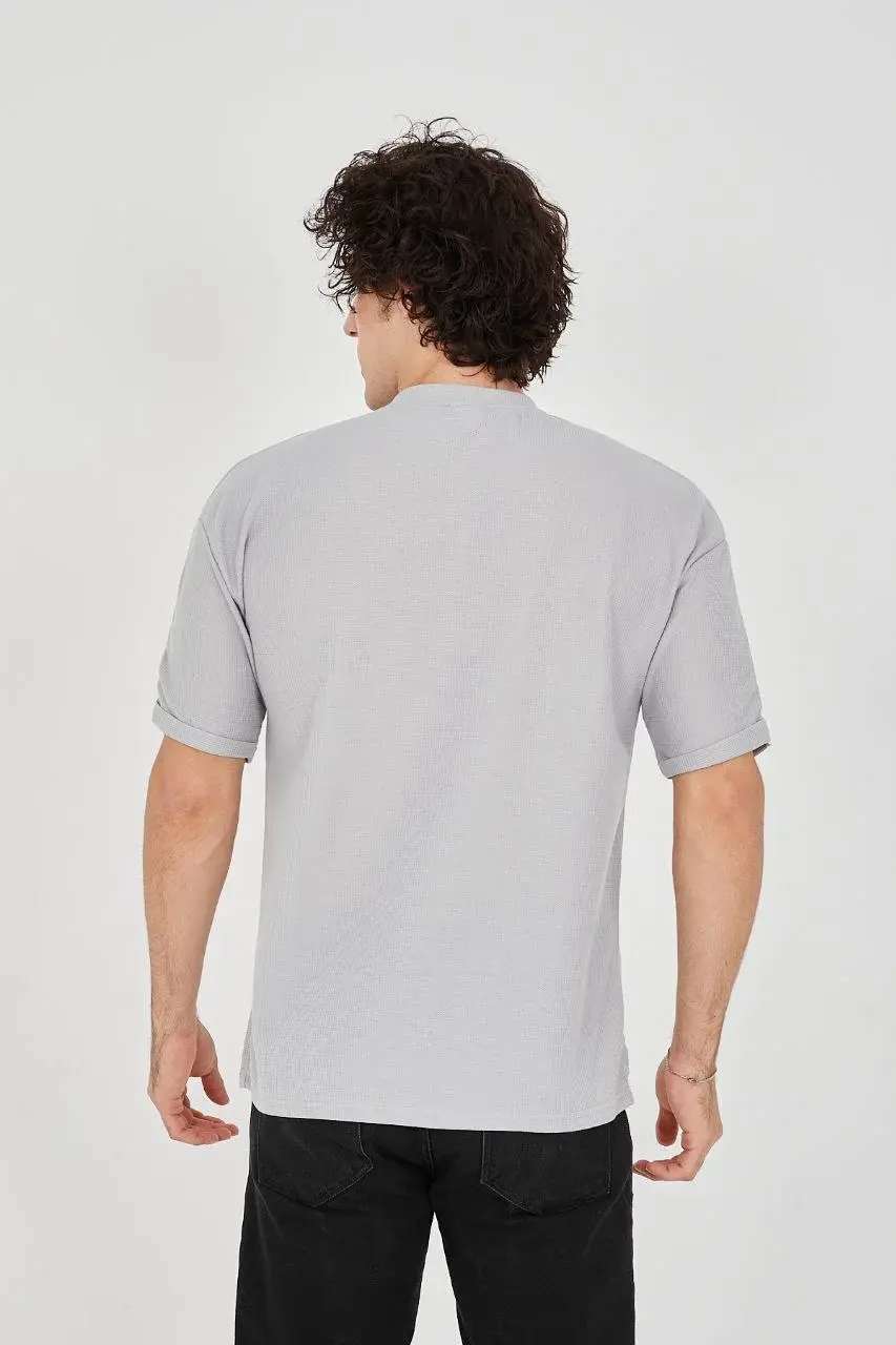 Unisex Waffle Kumaş Rahat Kol T-Shirt - Boyalı Gri