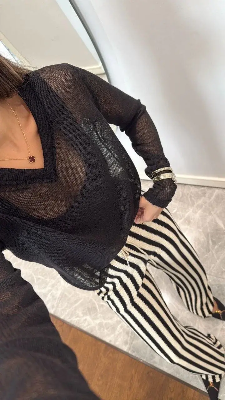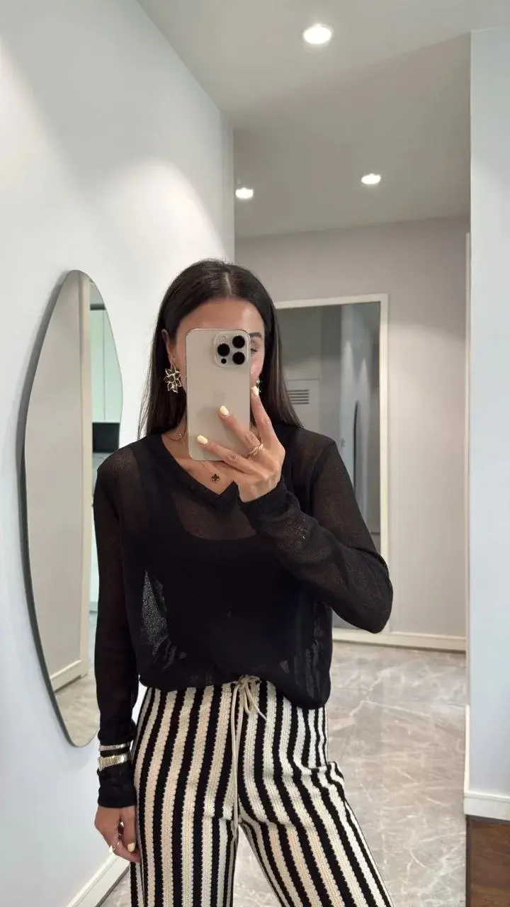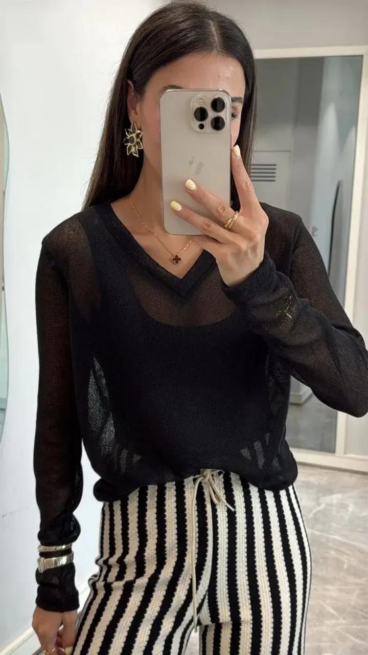 V Yaka uzun Kollu Triko ince Bluz - Siyah