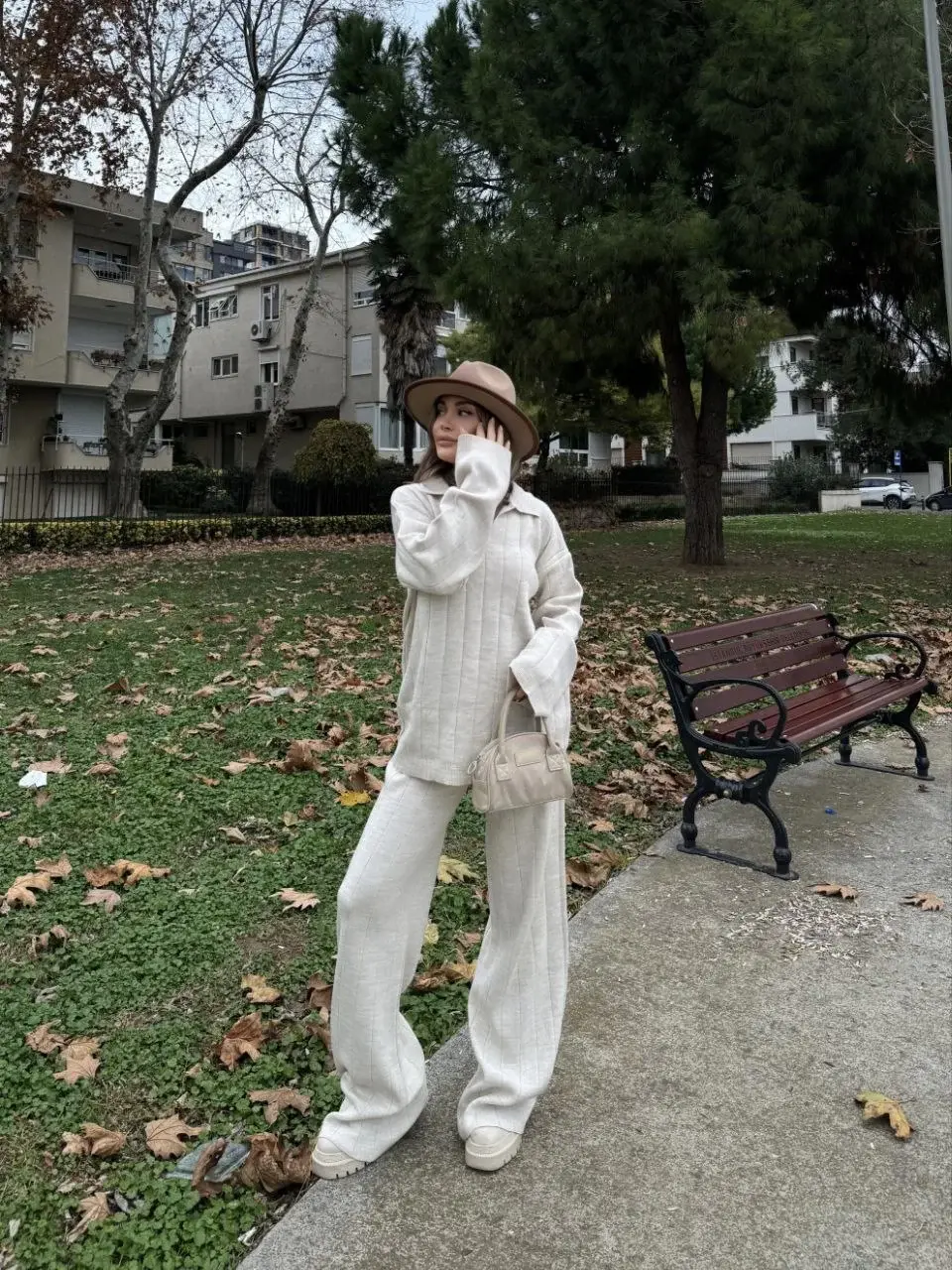 Yakalı Cizgi Detaylı Triko İkili Takım - Beyaz
